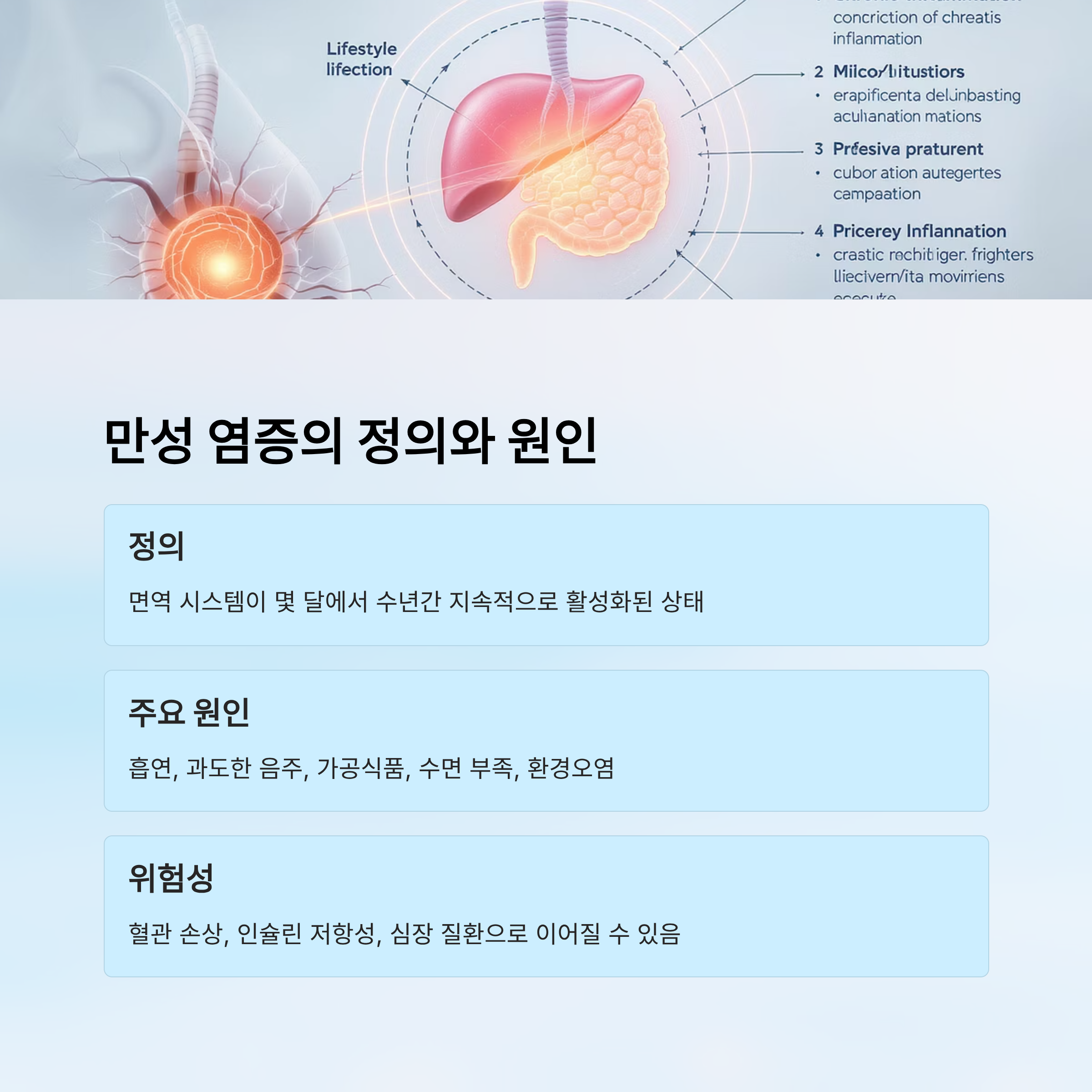 만성 염증은 면역 시스템이 정상적으로 위협을 제거한 뒤에도 지속적으로 활성화된 상태를 말해요. 급성 염증이 몇 시간에서 며칠 사이에 끝나는 것과 달리, 만성 염증은 몇 달, 심지어 수년에 걸쳐 이어질 수 있죠. 이러한 장기적인 염증은 몸 안의 정상 조직까지 공격하여 건강에 심각한 문제를 일으킬 수 있어요.