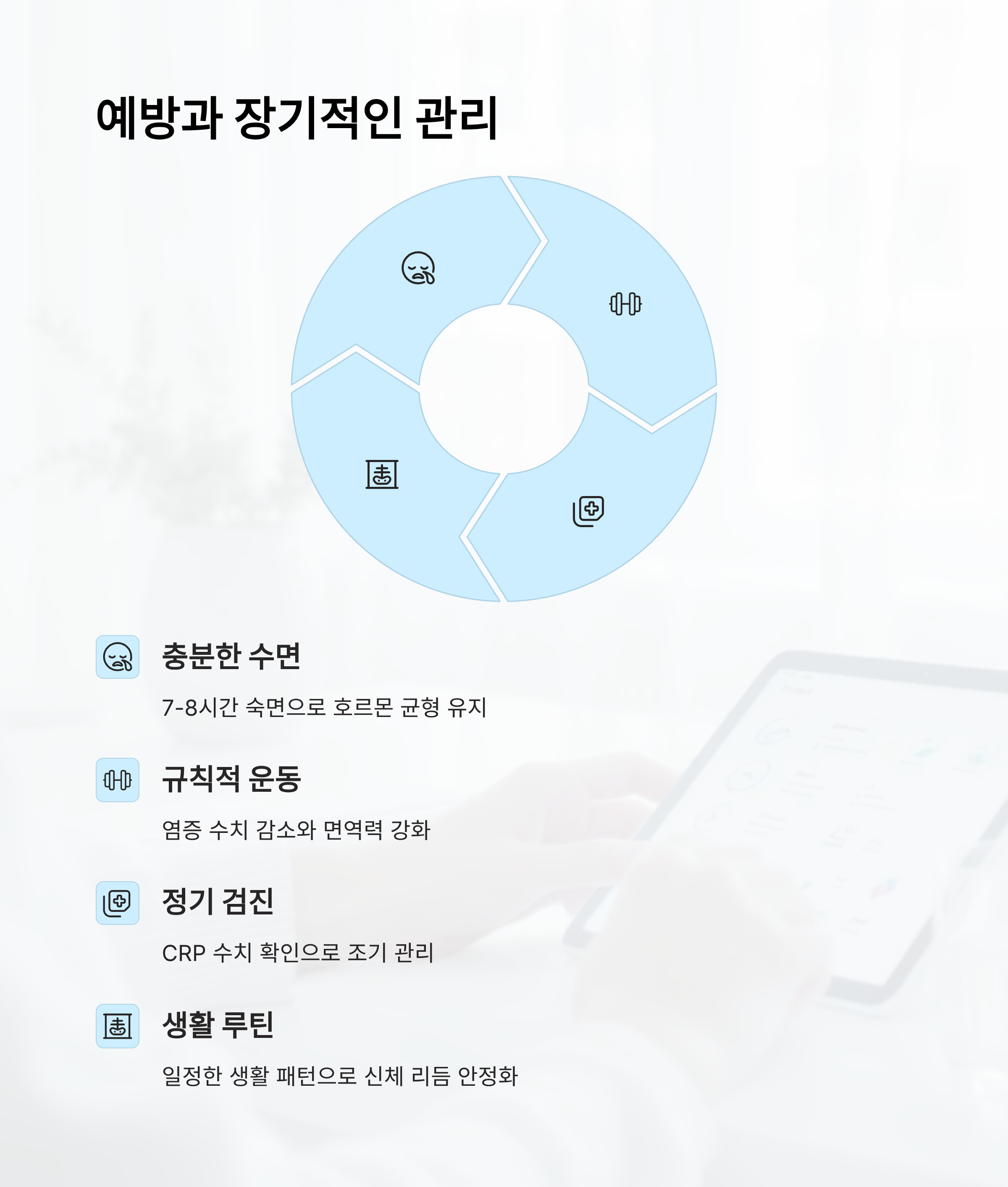 장기적으로는 자신만의 루틴을 만드는 것이 좋아요. 일정한 시간에 자고 일어나며, 운동과 식사 시간을 규칙적으로 지키는 생활은 신체 리듬을 안정화시켜요. 이런 꾸준한 관리가 결국 만성 염증을 예방하고 면역력을 강화하는 최선의 방법이에요.
