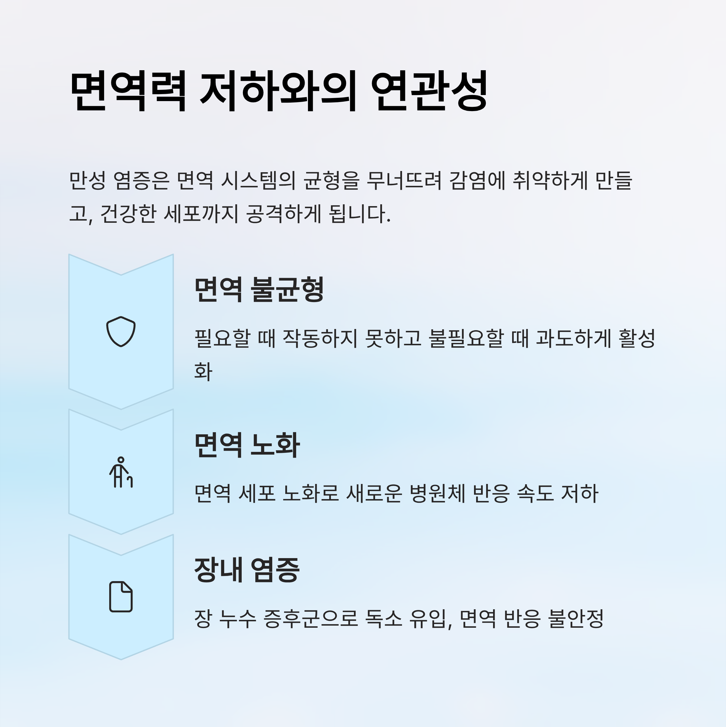 | 만성 염증 | 지속적이고 불안정한 반응 | 면역 저하, 조직 손상 |