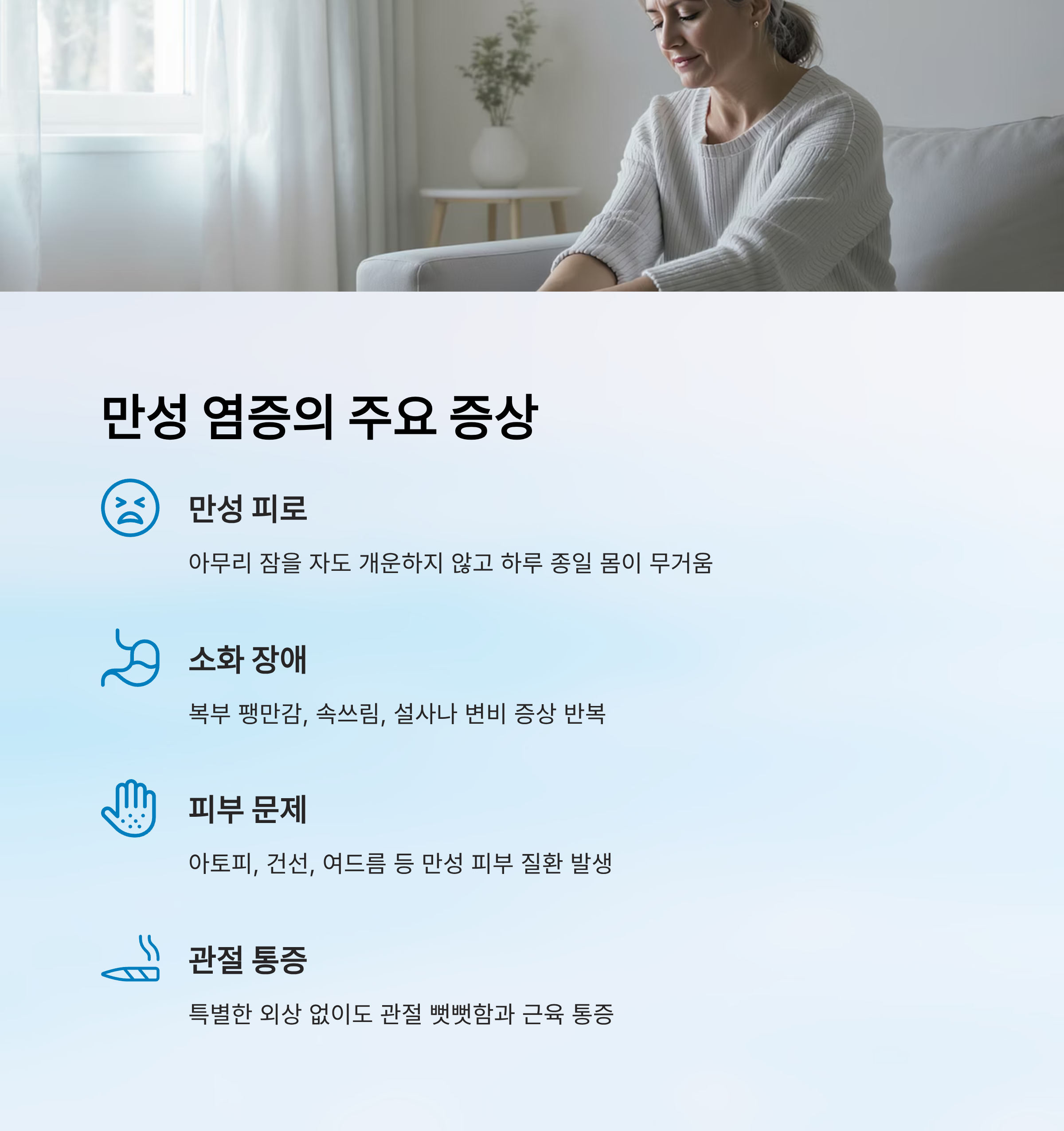 만성 염증은 급성 염증처럼 발열이나 통증이 명확하게 나타나지 않을 때가 많아요. 그래서 초기에는 대수롭지 않게 넘어가는 경우가 많지만, 시간이 지나면서 여러 가지 신호로 몸이 알려주기 시작해요. 피곤함이 쉽게 풀리지 않거나, 작은 감염에도 자주 걸린다면 몸에서 보내는 중요한 경고일 수 있어요.