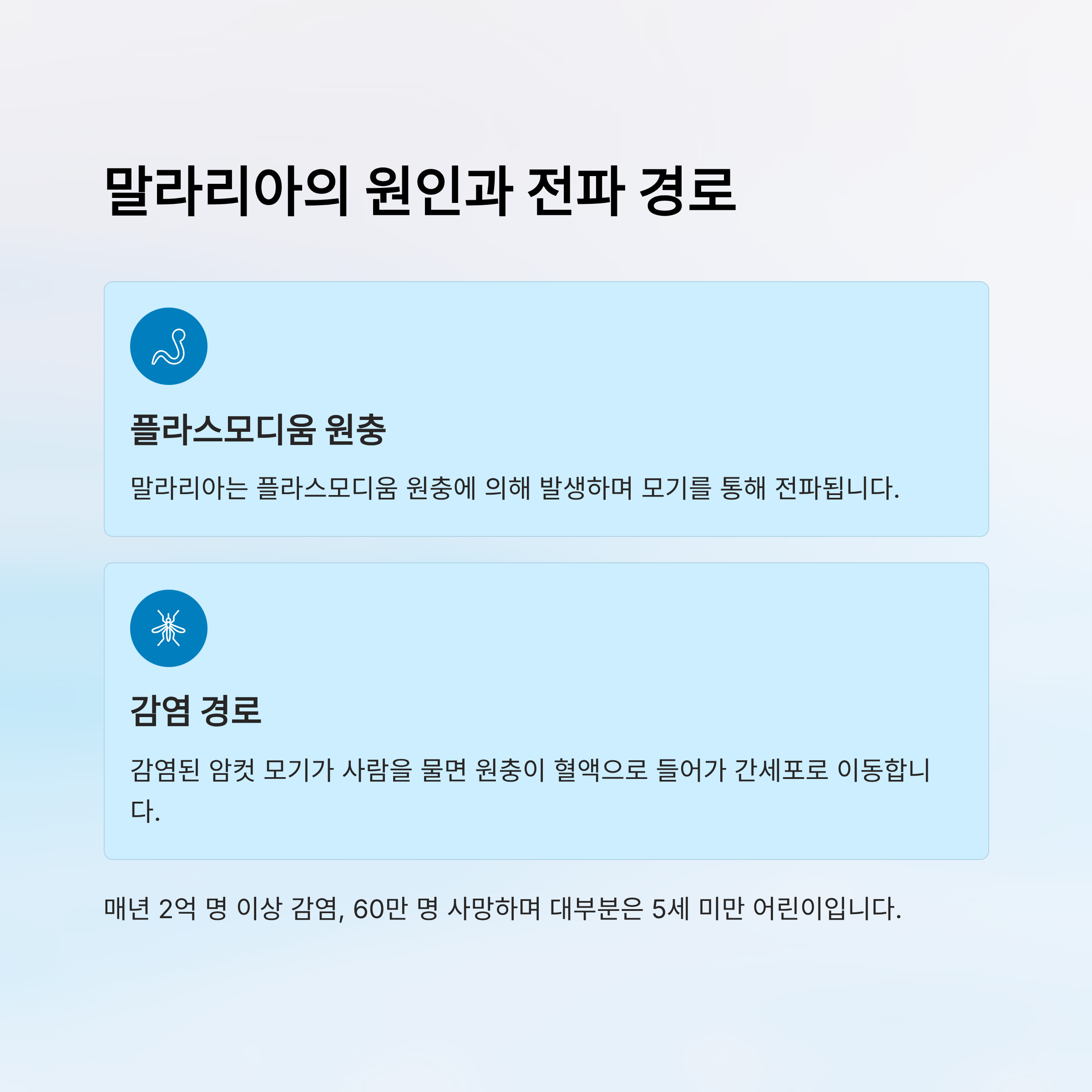 말라리아는 플라스모디움(Plasmodium)이라는 원충에 의해 발생하는 감염병이에요. 이 원충은 사람에게 직접 전파되지 않고, 매개체인 모기를 통해 옮겨요. 구체적으로는 열대열 말라리아 원충(Plasmodium falciparum), 삼일열 말라리아 원충(Plasmodium vivax), 사일열 말라리아 원충(Plasmodium malariae), 난형열 말라리아 원충(Plasmodium ovale)이 주요 원인체랍니다.