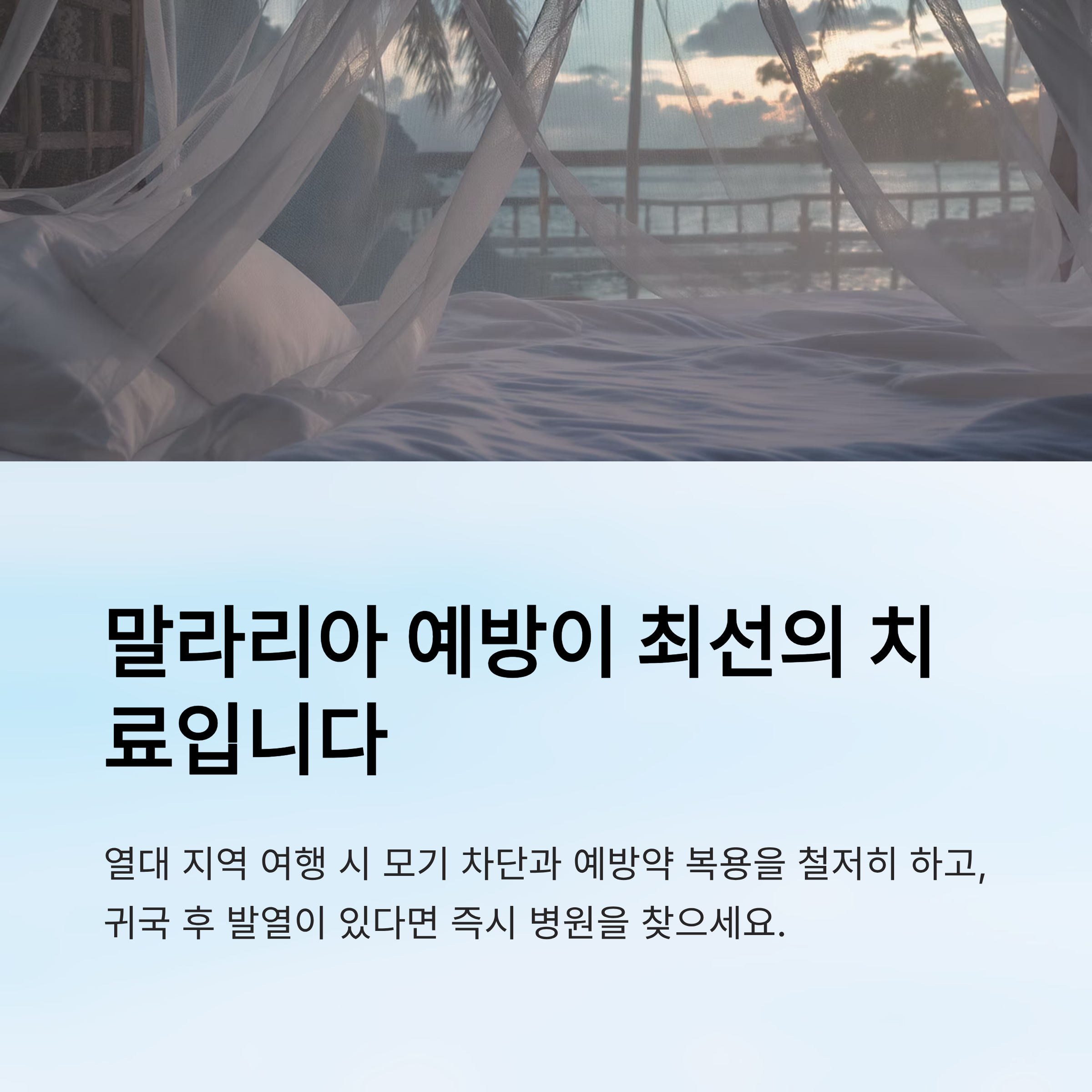 👉 요약하면, 말라리아는 조기 진단과 맞춤형 항말라리아제 투여가 핵심입니다. 특히 열대열 말라리아는 진행 속도가 매우 빠르므로, 위험 지역 여행 후 발열 증상이 나타난다면 지체하지 말고 병원을 찾아야 합니다.