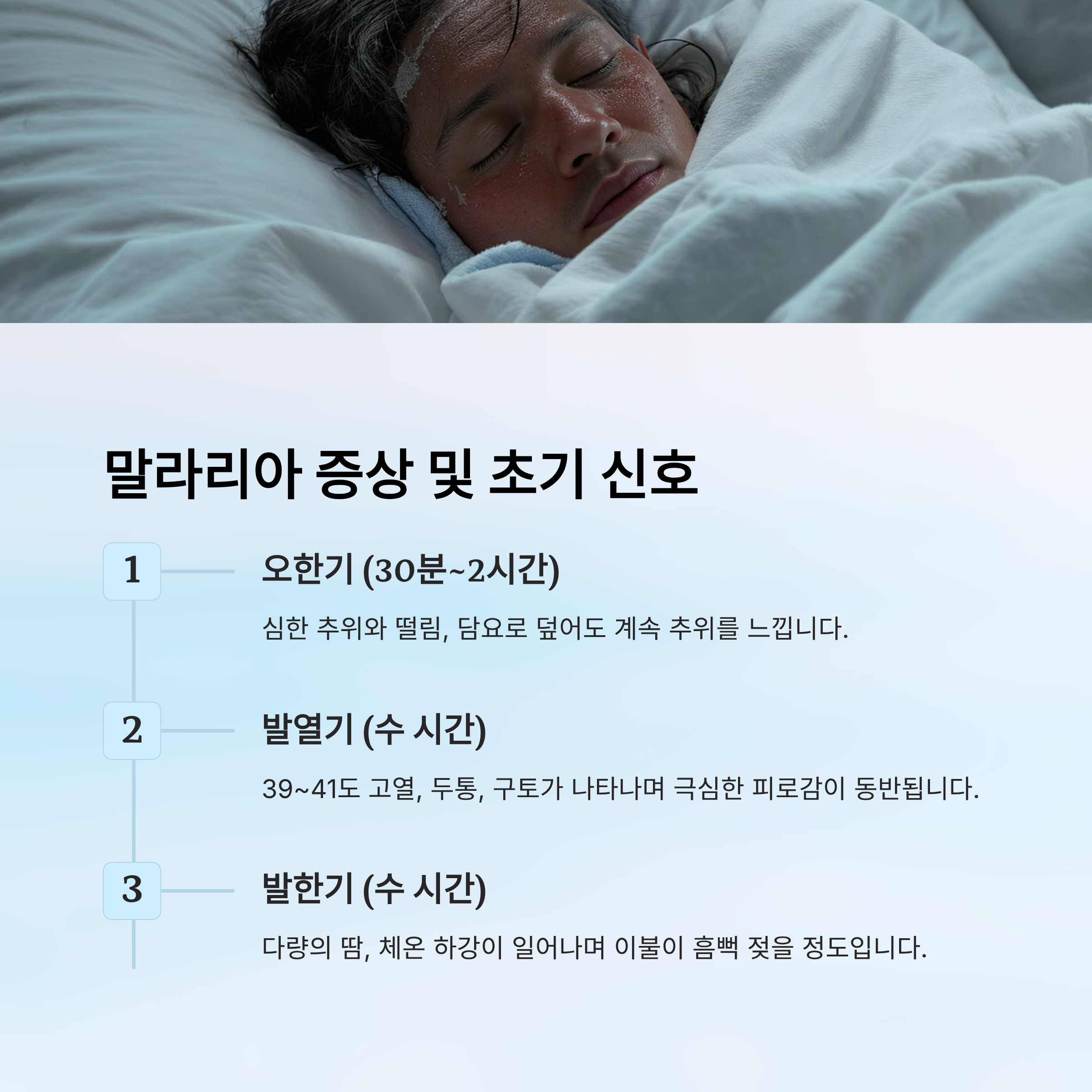 말라리아는 단순한 감기나 독감과 달리 오한과 고열이 주기적으로 반복되는 독특한 증상이 특징입니다. 특히 열대 지역이나 아열대 지역을 방문한 후 발열, 두통, 구토, 심한 피로가 나타난다면 반드시 말라리아를 의심해야 합니다.