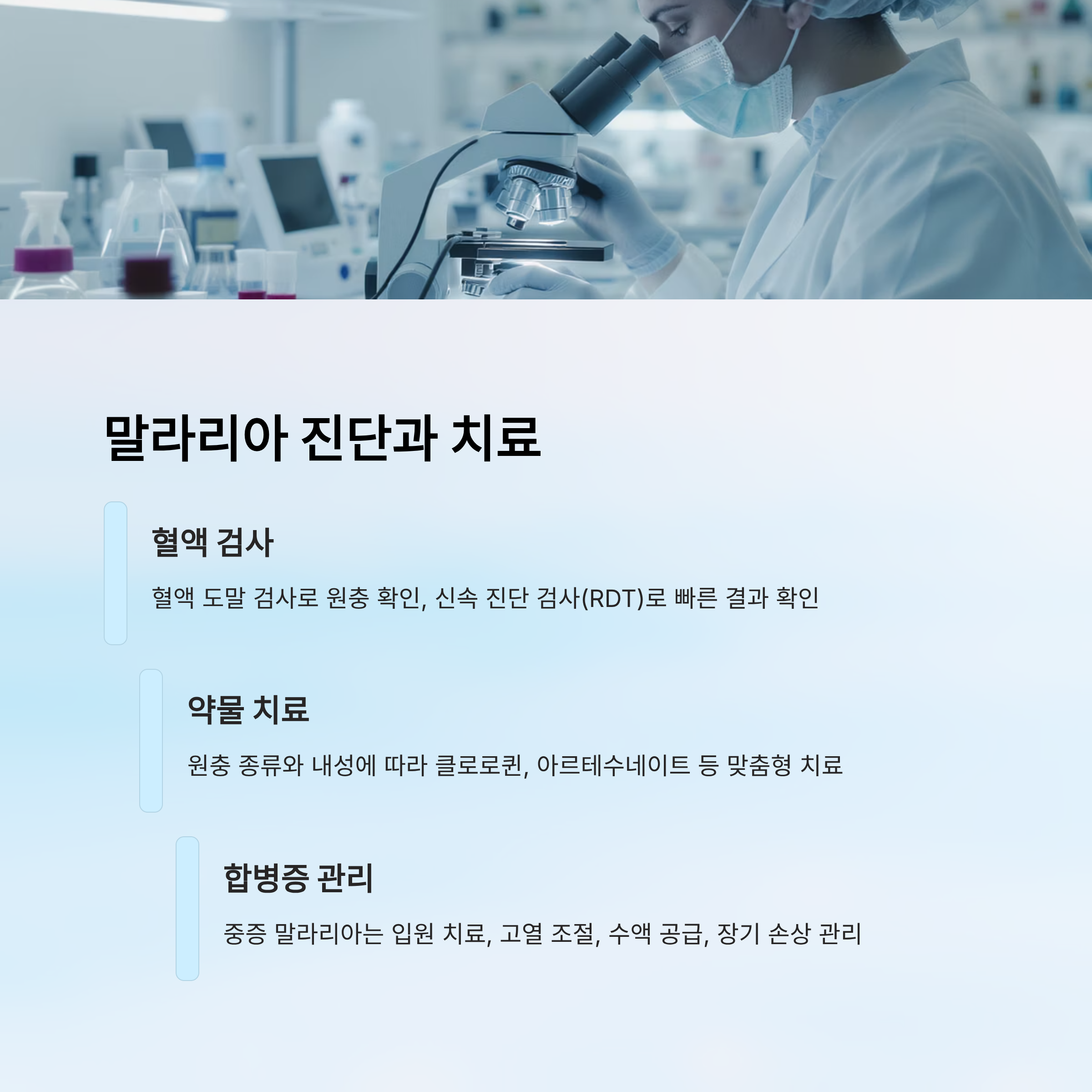 말라리아는 조기 발견과 신속한 치료가 생명을 구하는 핵심이에요. 증상이 나타나면 즉시 병원을 방문해 혈액 검사와 항말라리아제 치료를 받아야 합니다.