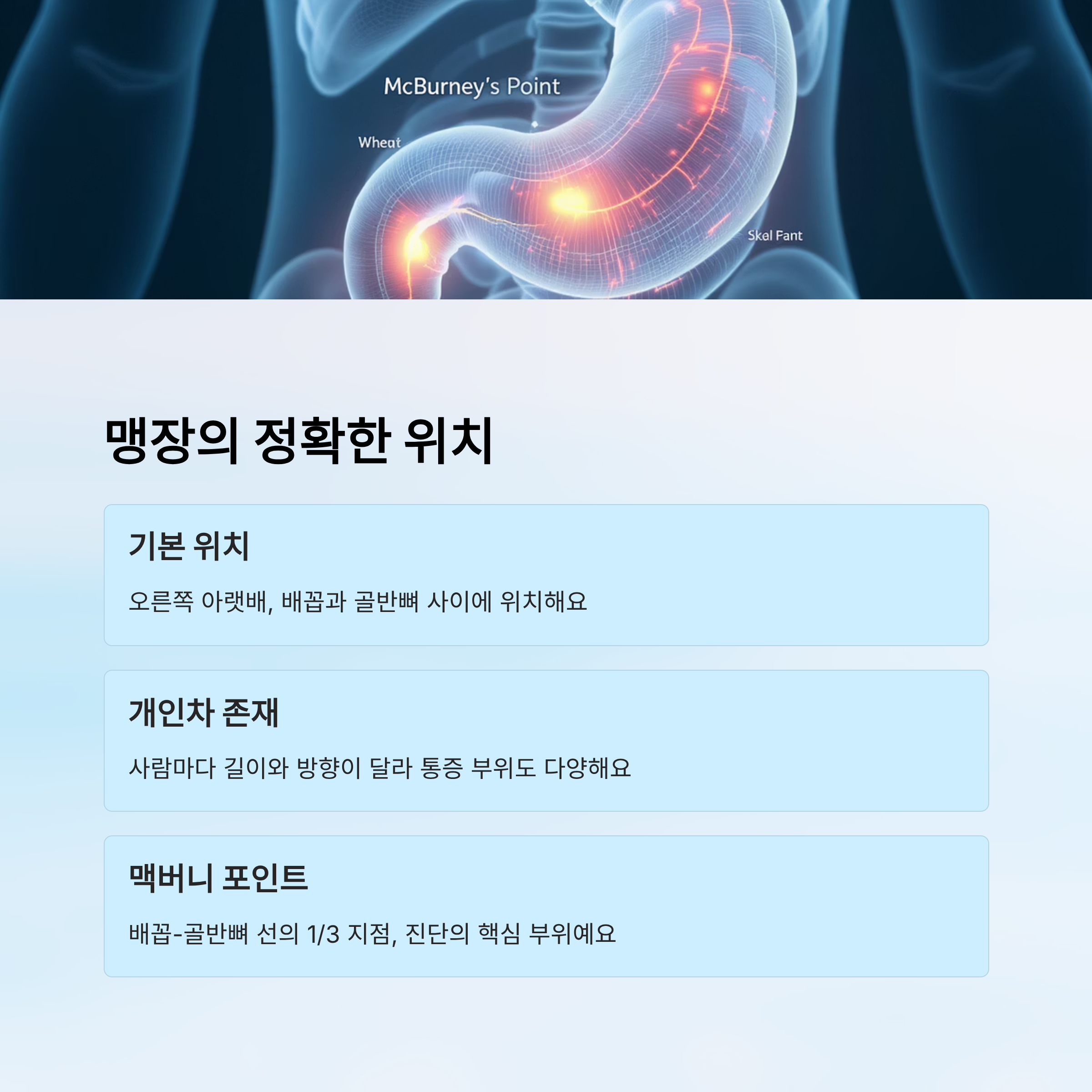 맹장은 해부학적으로 소장과 대장이 이어지는 지점에 위치하며, 소화기관의 작은 주머니 같은 구조예요. 보통 오른쪽 하복부, 즉 배꼽과 골반뼈 사이쯤에 자리해요. 이 위치는 사람마다 조금씩 차이가 있어서 증상이 다양하게 나타날 수 있답니다.