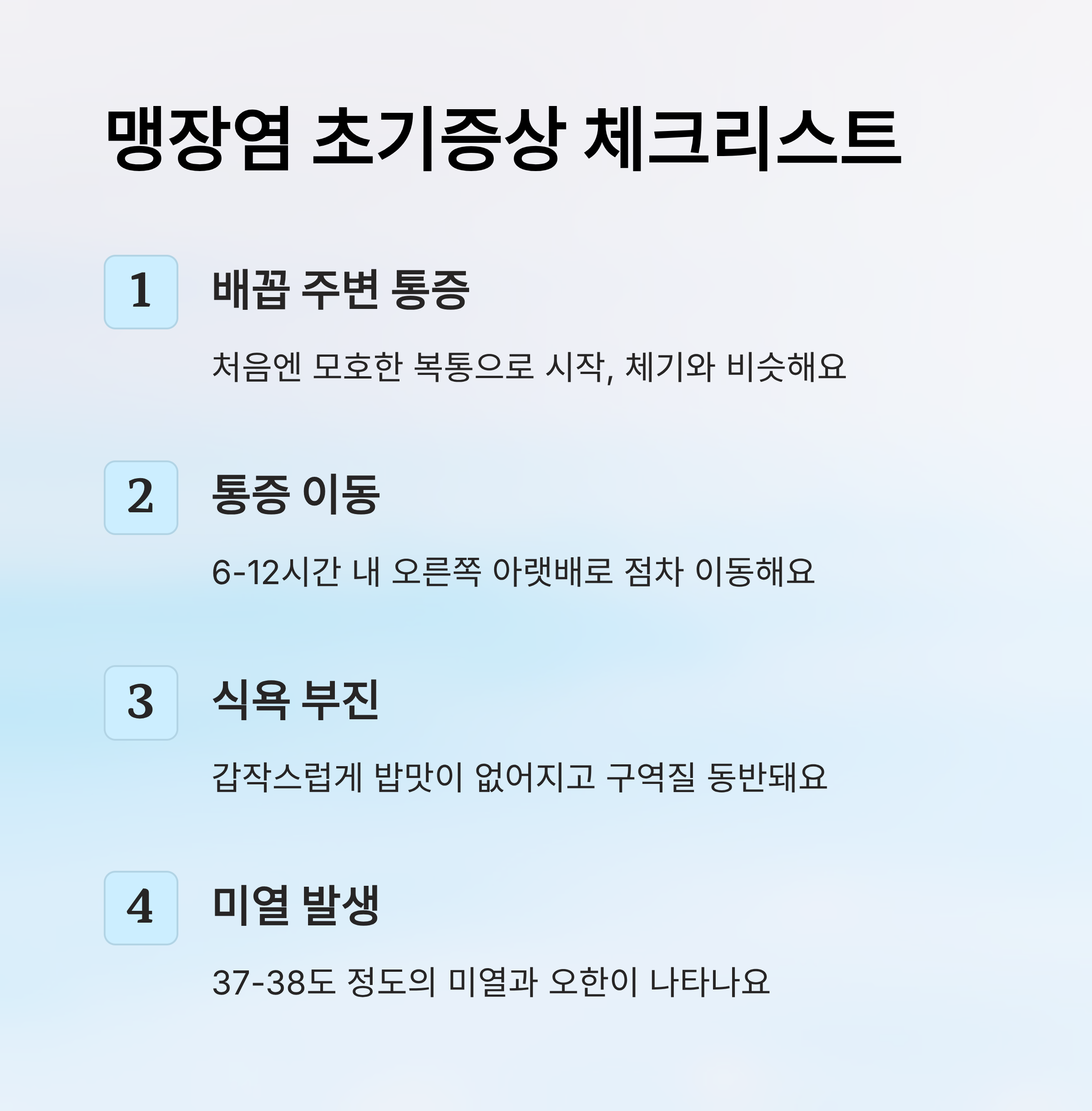 맹장염의 가장 뚜렷한 특징은 통증의 이동이에요. 대부분 처음에는 배꼽 주위가 뻐근하게 아프기 시작해요. 이 통증은 장이 막히면서 발생하는 내장성 통증으로, 위치가 애매하고 퍼져 있어서 단순한 체기나 소화불량과 비슷하게 느껴져요. 하지만 시간이 지나면서 염증이 진행되면 맹장 주변 복막이 자극되면서 통증이 오른쪽 아랫배로 국소화돼요.
