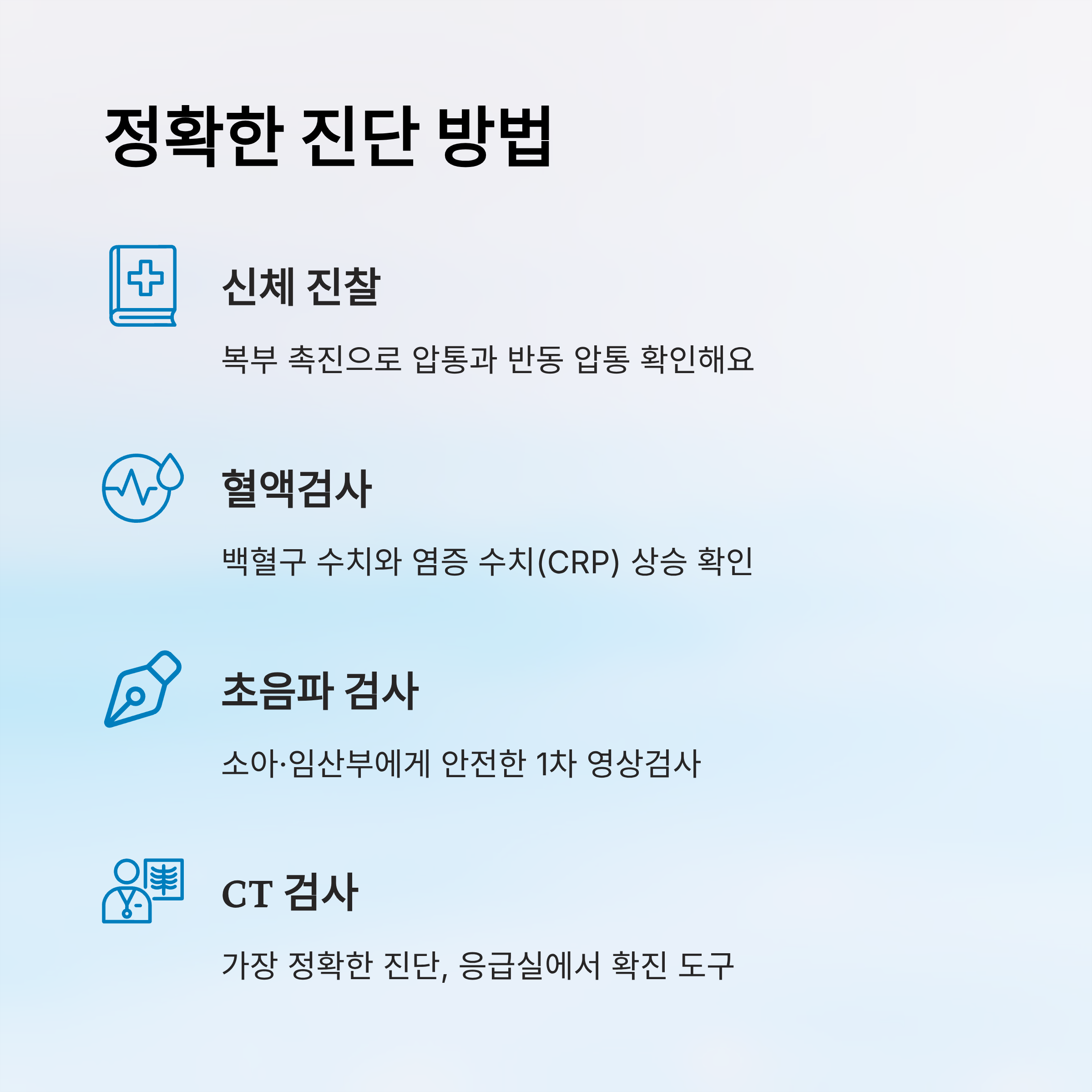 맹장염은 증상이 전형적이지 않은 경우가 많아서 정확한 진단이 쉽지 않아요. 그래서 의사들은 환자의 증상 설명과 신체 진찰, 그리고 영상 검사를 종합해 판단해요. 가장 먼저 시행되는 것은 복부 촉진 검사예요. 의사가 배를 누르면서 통증이 심해지는 부위를 확인하고, 반동 압통이나 근육 경직이 있는지 살펴요.