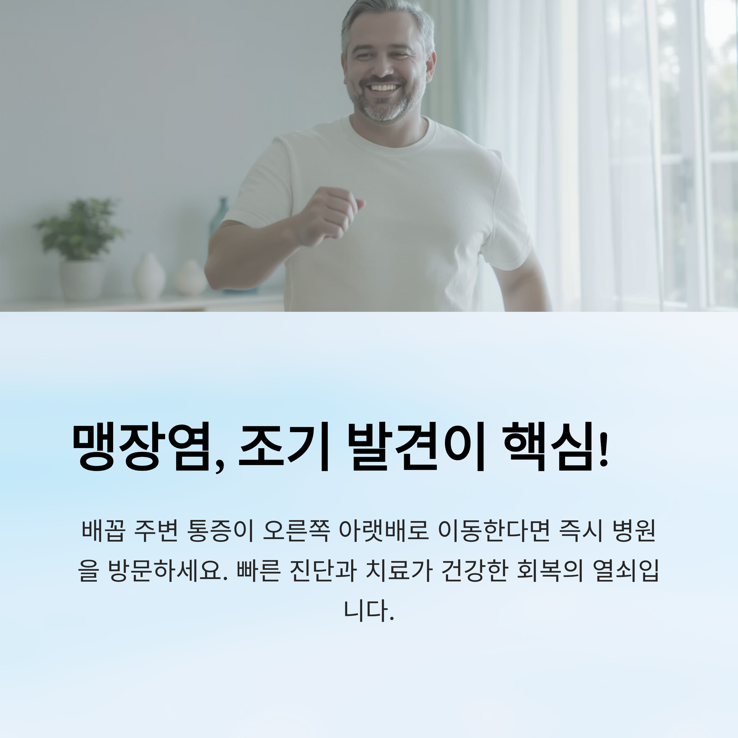즉, 맹장염 통증은 처음에는 퍼진 듯 애매하다가 점점 오른쪽 아랫배로 옮겨가면서 강도가 세지는 것이 특징이에요. 이러한 변화 패턴을 기억해두면 조기 진단에 큰 도움이 되고, 적절한 시점에 병원을 찾는 계기가 될 수 있어요. 🩺
