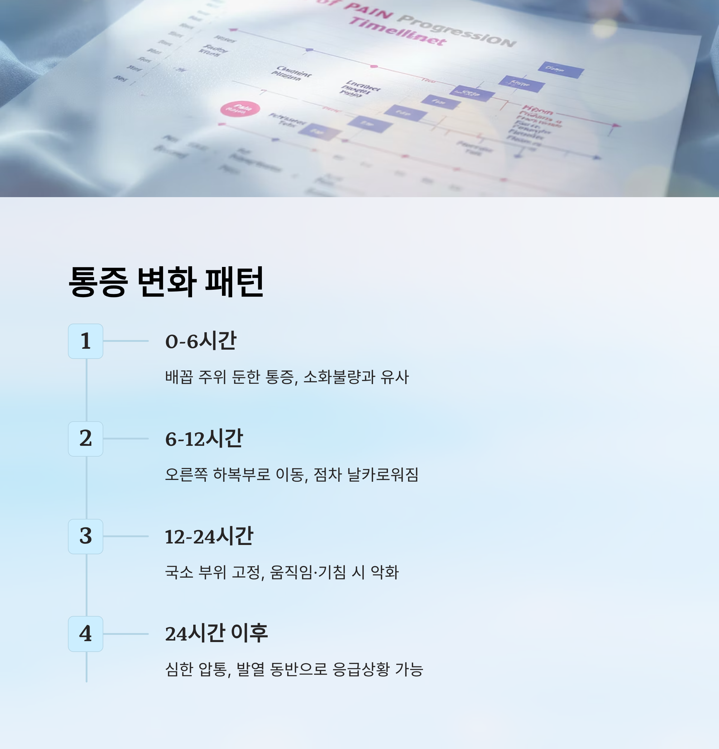 | 24시간 이후 | 오른쪽 하복부 또는 변이 위치 | 심한 압통·발열 동반 가능 |