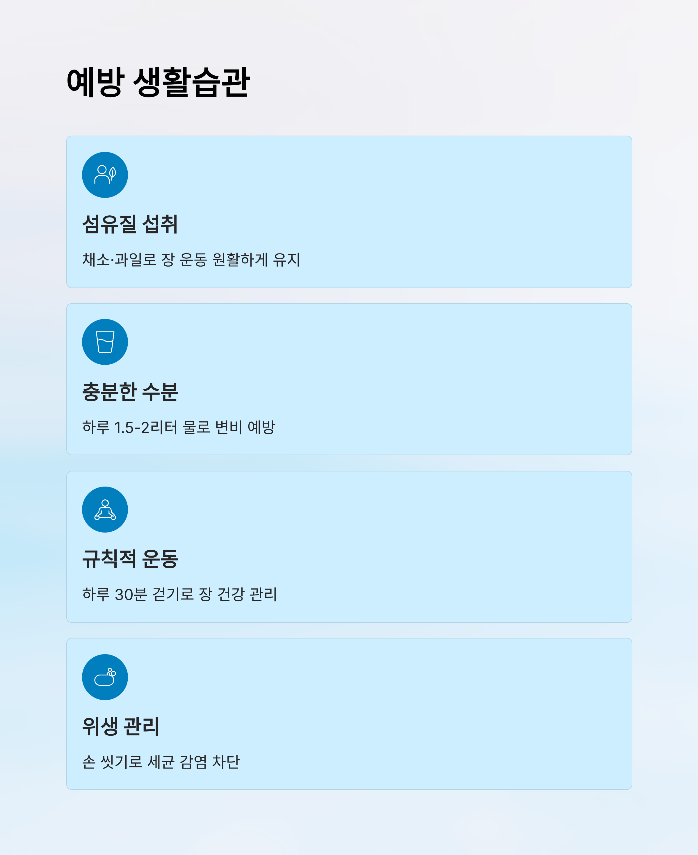 물도 충분히 마셔야 해요. 수분이 부족하면 대장이 건조해지고 변이 단단해져서 맹장에 압력이 가해질 수 있어요. 하루 1.5~2리터 정도의 물을 꾸준히 섭취하는 게 좋아요. 커피나 탄산음료는 오히려 탈수를 유발할 수 있으니 물 위주로 마시는 습관을 가지는 게 안전해요.