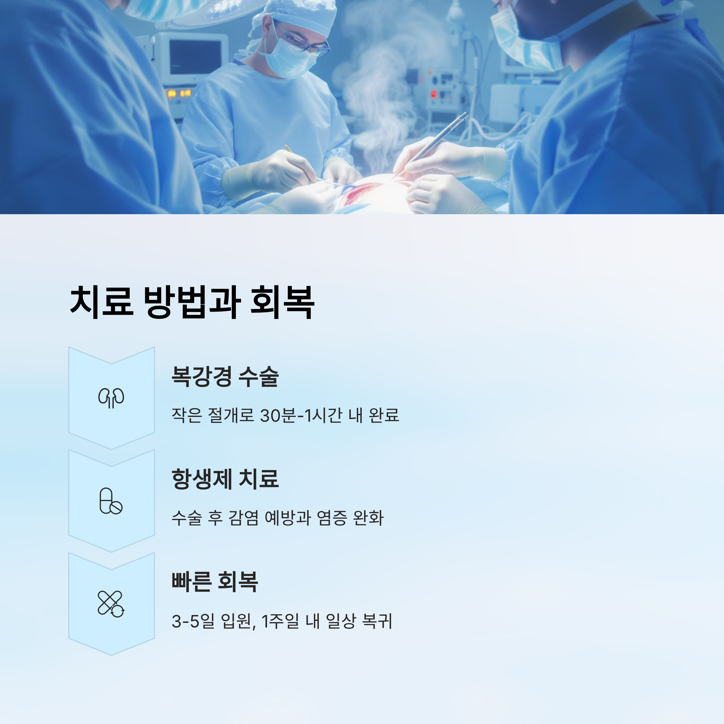 복강경 수술은 보통 30분에서 1시간 이내에 끝나요. 수술 후에는 수액 치료와 항생제를 병행하면서 회복을 도와요. 환자 대부분은 3~5일 정도면 퇴원할 수 있어요. 어린아이들은 회복이 빠른 편이고, 노인이나 기저질환이 있는 경우에는 조금 더 시간이 걸릴 수 있어요.