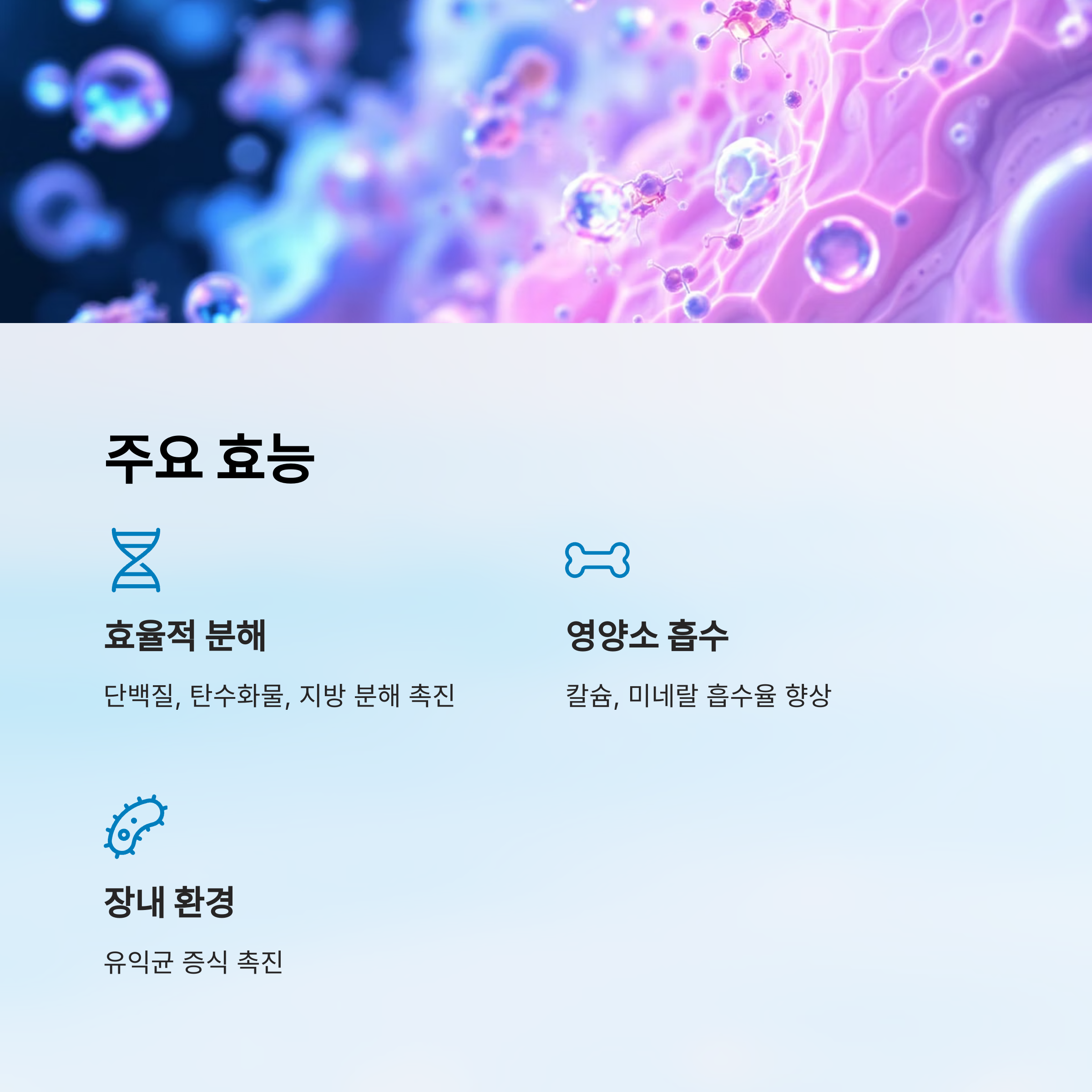 카무트효소는 단순한 ‘효소 보충제’가 아니에요. 이 효소는 우리 몸의 소화 과정에 아주 밀접하게 작용하면서 불편한 위장 증상을 줄이고, 음식물을 효과적으로 분해해주는 역할을 해요. 특히 단백질과 탄수화물 소화에 도움을 주는 주요 효소들이 골고루 들어있어 더욱 효과적이죠.