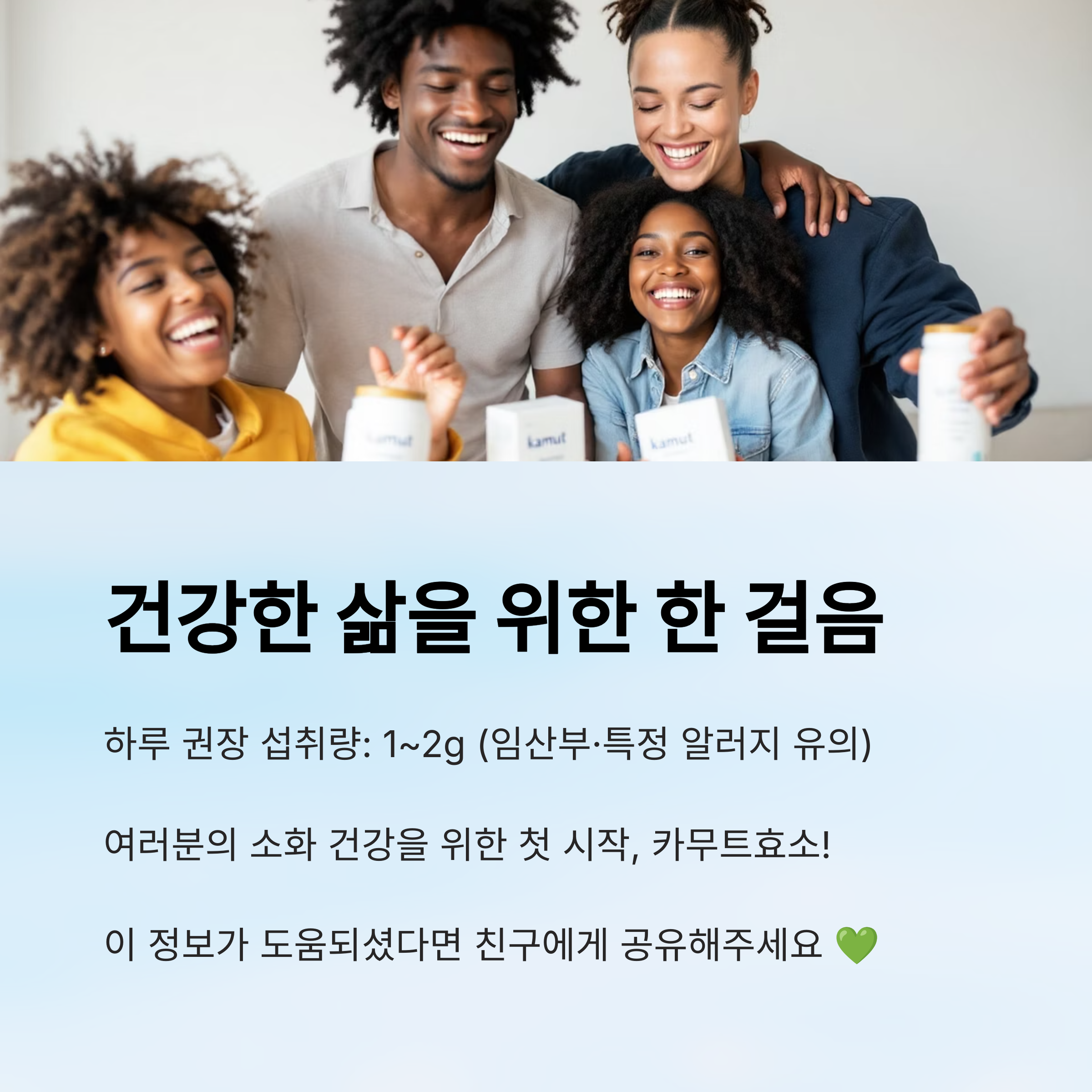 이처럼 소화 전체 과정에서 카무트효소는 아주 전략적인 역할을 해요. 그냥 단순히 ‘먹고 나면 속 편하다’가 아니라, 그 속에는 과학적으로 설계된 작용 메커니즘이 숨어 있답니다. 😊