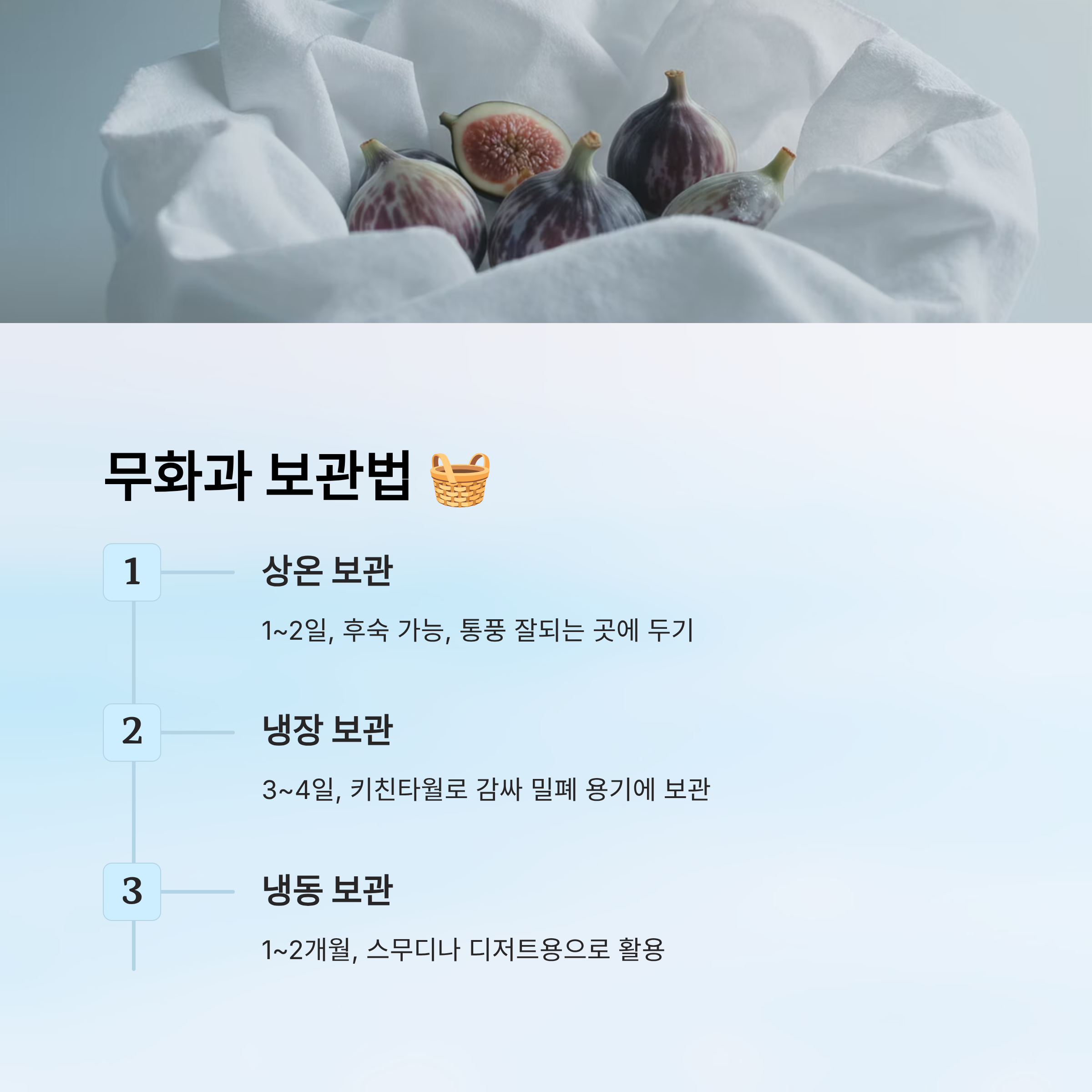 A2. 무화과는 상온에서는 하루 이틀 정도만 신선해요. 냉장 보관 시 2~3일, 밀폐 용기에 넣으면 조금 더 오래 두고 먹을 수 있어요. 장기 보관하려면 냉동 보관을 추천해요.