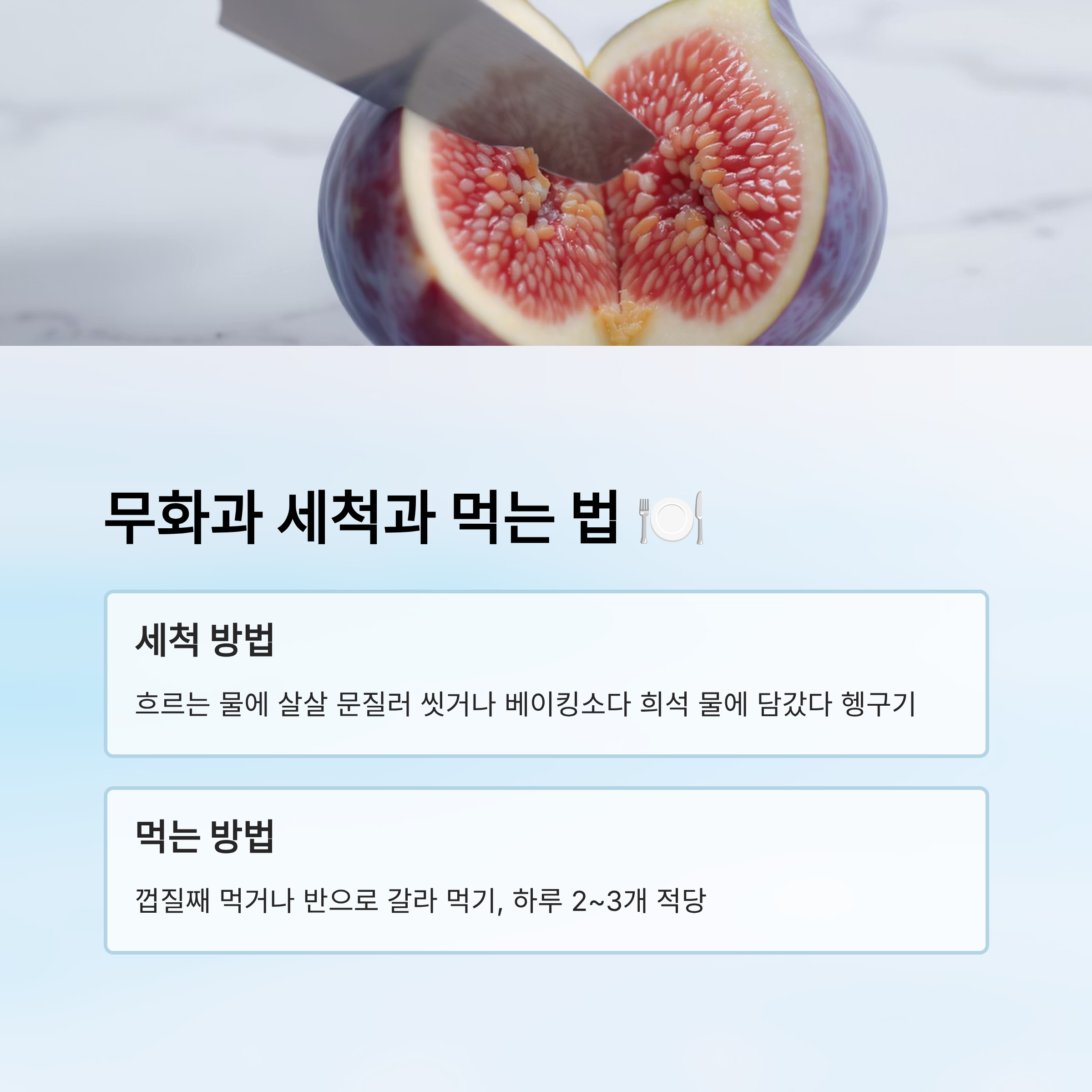 무화과는 껍질째 먹을 수 있는 과일이에요. 하지만 껍질 표면에 미세한 털과 불순물이 묻어 있을 수 있어서 제대로 세척하는 것이 중요해요. 흐르는 물에 살살 문질러 씻거나, 베이킹소다를 희석한 물에 잠시 담갔다가 헹궈내면 깨끗하게 즐길 수 있답니다. 껍질이 얇고 부드럽기 때문에 너무 세게 문지르면 상처가 날 수 있으니 조심해야 해요.