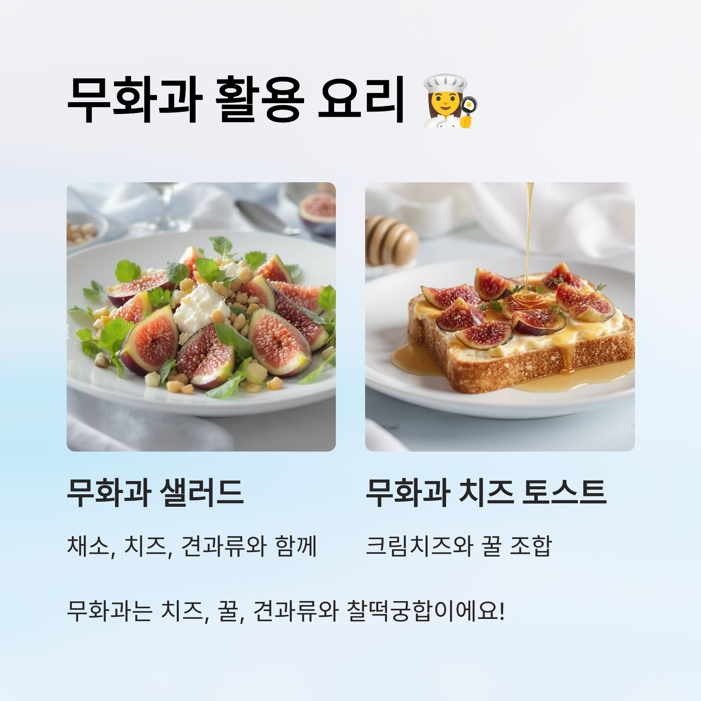 무화과는 단독으로 먹는 것뿐만 아니라 요리에 곁들이면 훨씬 풍미가 살아나요. 샐러드에 넣으면 상큼하면서도 달콤한 포인트가 되고, 치즈와 곁들이면 고급스러운 풍미를 즐길 수 있어요. 특히 리코타 치즈, 블루 치즈와 함께 먹으면 달콤함과 짭조름함이 조화를 이루어 근사한 맛을 만들어내요.