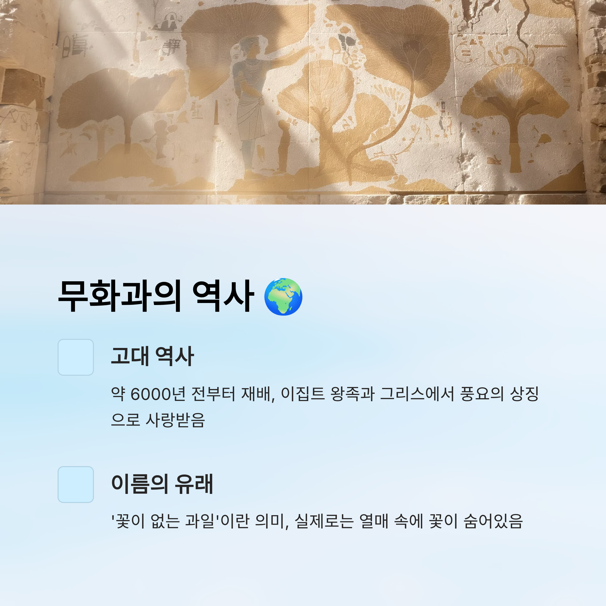 무화과는 인류 역사상 가장 오래된 과일 중 하나로 꼽혀요. 고고학적 기록에 따르면 무화과는 약 6000년 전부터 재배된 흔적이 있으며, 고대 메소포타미아와 이집트 지역에서 귀한 과일로 취급되었답니다. 이집트의 벽화와 무덤 장식에도 무화과가 자주 등장하는데, 이는 당시 왕족과 귀족이 즐겨 먹었던 과일이라는 사실을 보여줘요.