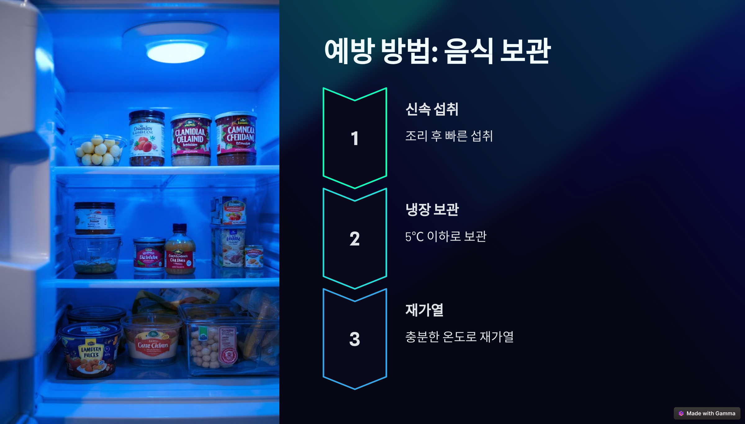 조리된 음식은 가능한 한 빨리 섭취하고, 남은 음식은 5℃ 이하로 냉장 보관해야 합니다. 특히 쌀밥과 같은 음식은 상온에 방치하지 않고 즉시 냉장 보관하는 것이 중요합니다. 냉장 보관 시에도 음식은 가급적 3일 이내에 소비해야 하며, 다시 데울 때는 충분히 가열해 세균을 사멸시켜야 합니다.