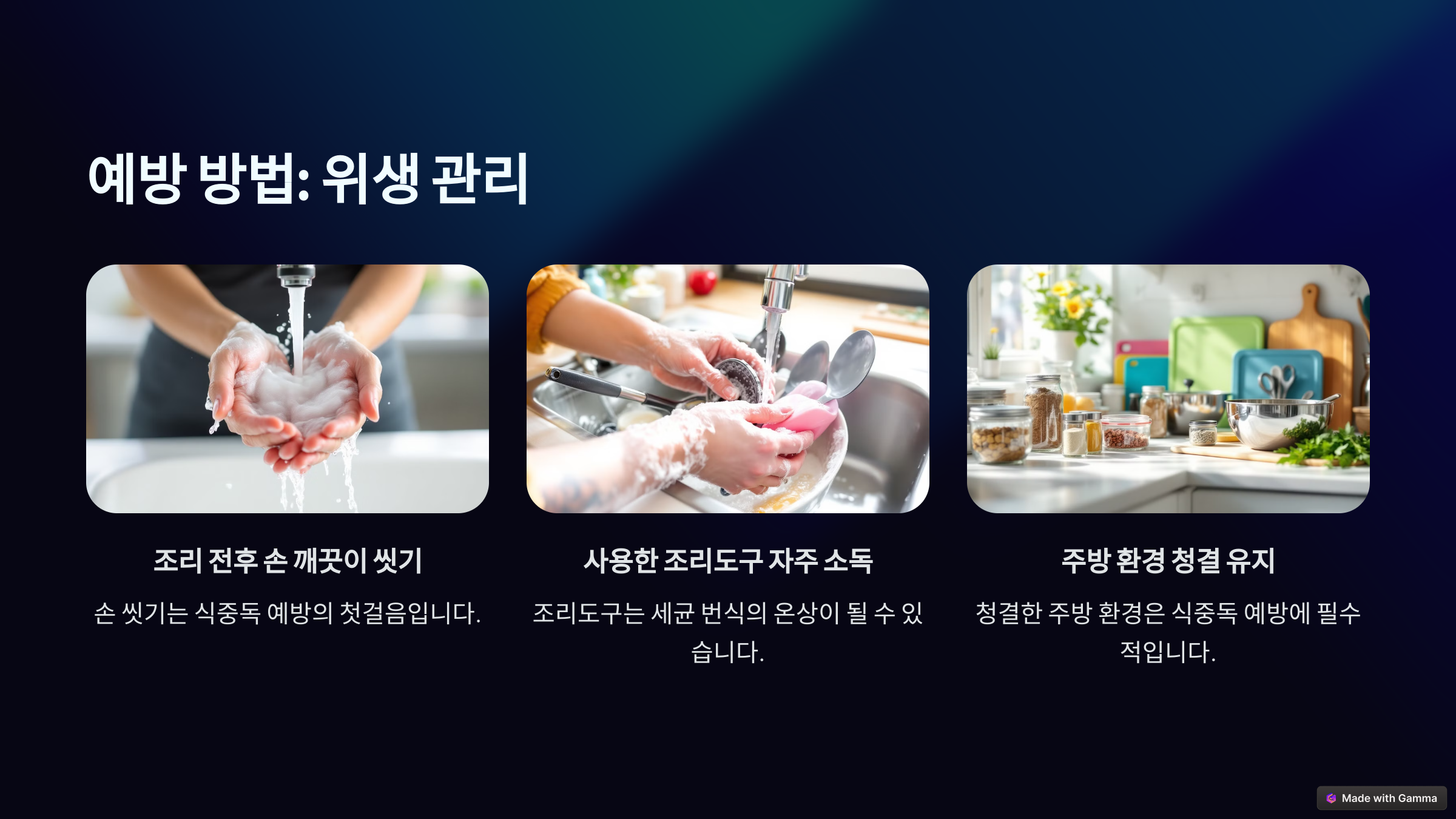 음식을 조리할 때는 손을 깨끗이 씻고, 사용한 조리 도구를 자주 소독해야 합니다. 세균이 쉽게 번식할 수 있는 조건을 없애기 위해, 주방 환경을 항상 청결하게 유지하는 것이 필수적입니다. 또한, 생고기와 가공되지 않은 음식은 다른 식재료와 분리해서 다루어야 교차 오염을 막을 수 있습니다.