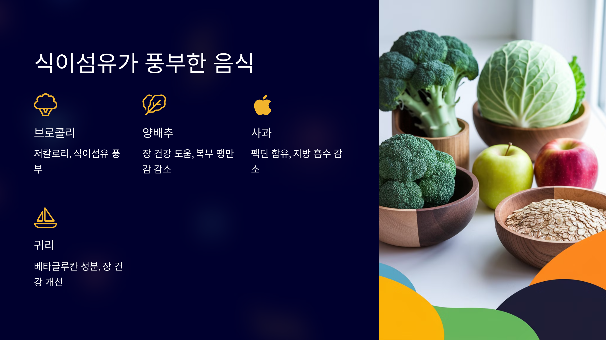 ✔️ **대표적인 식이섬유 식품** ✅ **브로콜리** - 저칼로리에 식이섬유가 풍부해요. ✅ **양배추** - 장 건강을 돕고 복부 팽만감을 줄여줘요. ✅ **사과** - 수용성 식이섬유인 펙틴이 풍부해 지방 흡수를 줄여요. ✅ **귀리** - 장 건강에 좋은 베타글루칸 성분이 들어 있어요.