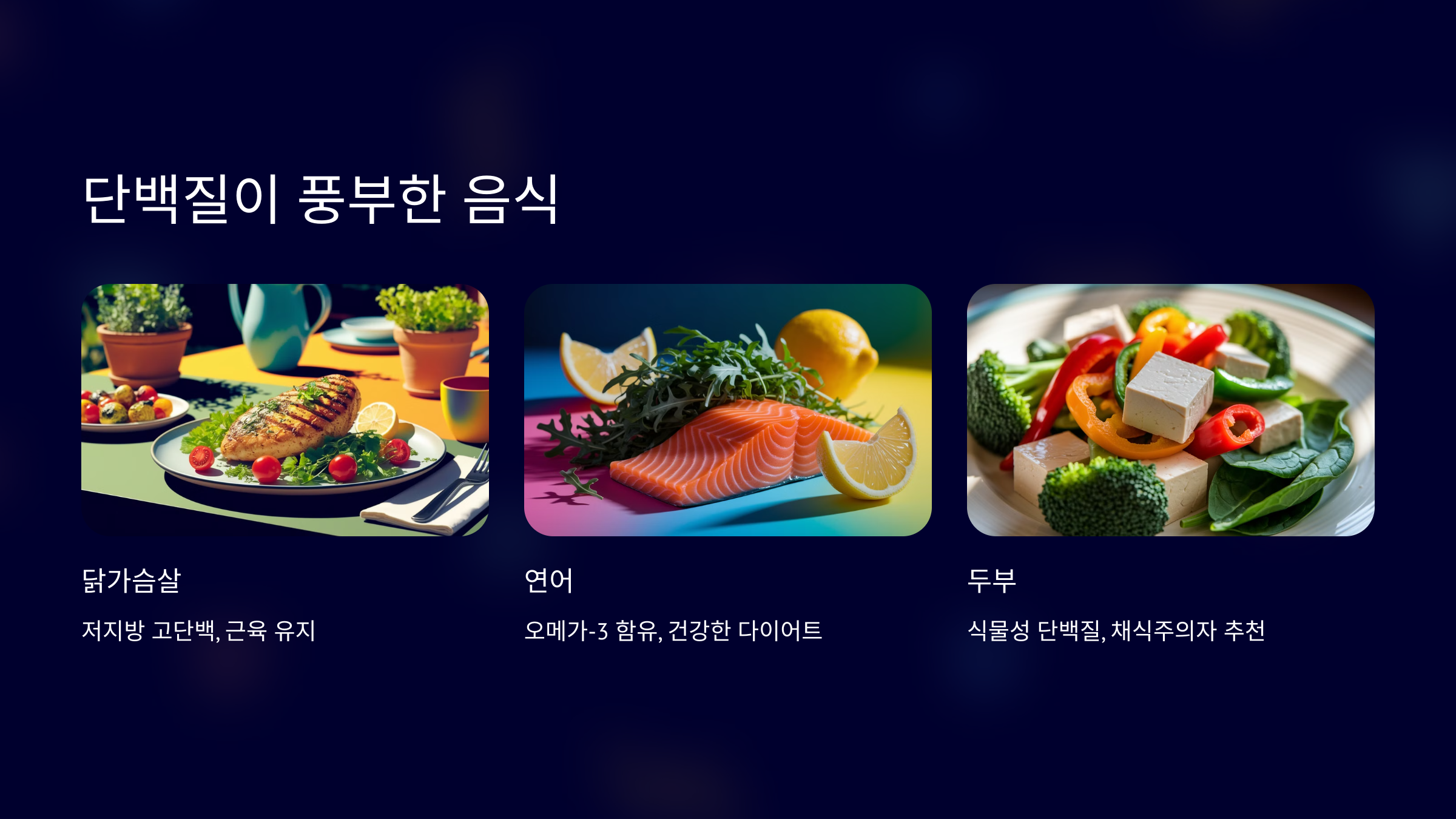 ✔️ **추천 단백질 식품** ✅ **닭가슴살** - 지방이 적고 단백질이 풍부해요. ✅ **연어** - 오메가-3 지방산이 포함되어 있어 건강한 다이어트에 좋아요. ✅ **두부** - 식물성 단백질이 많아 채식주의자들에게도 추천돼요. ✅ **달걀** - 완전 단백질 식품으로 근육 생성에 도움을 줘요.