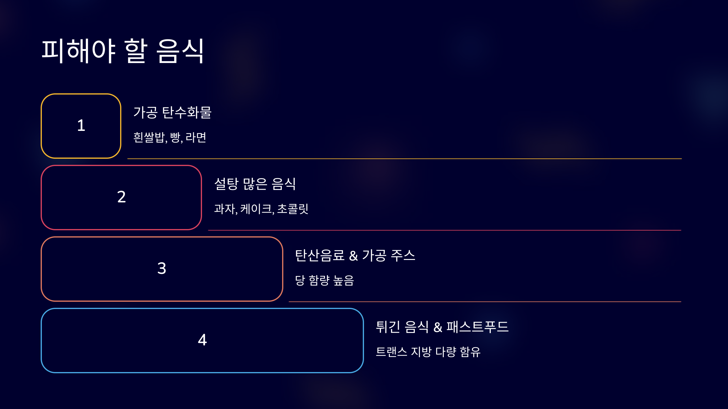 뱃살을 줄이기 위해서는 어떤 음식을 피해야 하는지도 알아야 해요. 아래 음식들은 과도한 섭취 시 지방 축적을 유발할 수 있어요.