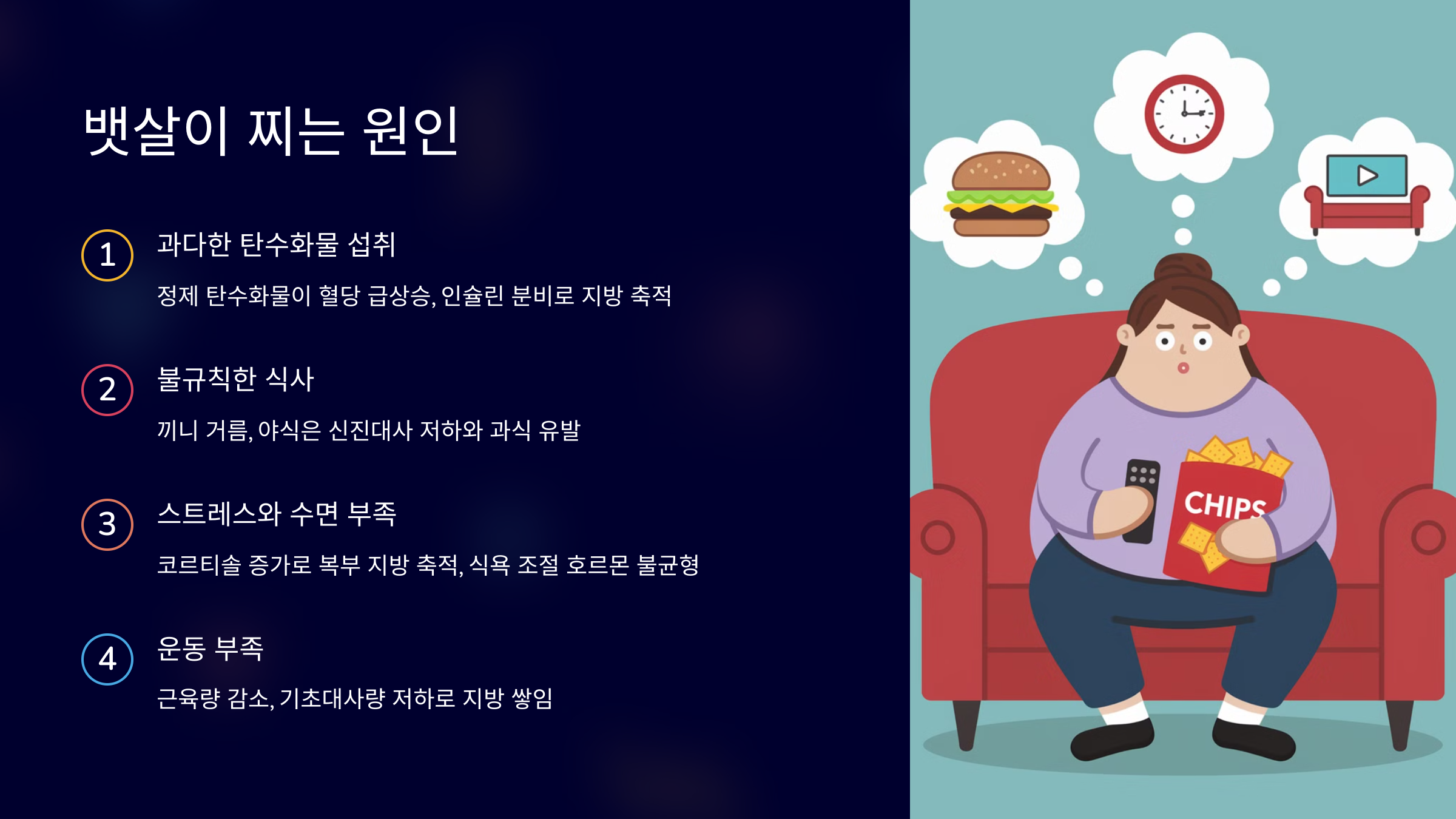 3️⃣ **스트레스와 수면 부족** 스트레스 호르몬인 코르티솔이 증가하면 지방이 복부에 집중적으로 쌓이게 돼요. 또한, 수면이 부족하면 식욕 조절 호르몬이 불균형해져 과식하게 될 확률이 높아요.