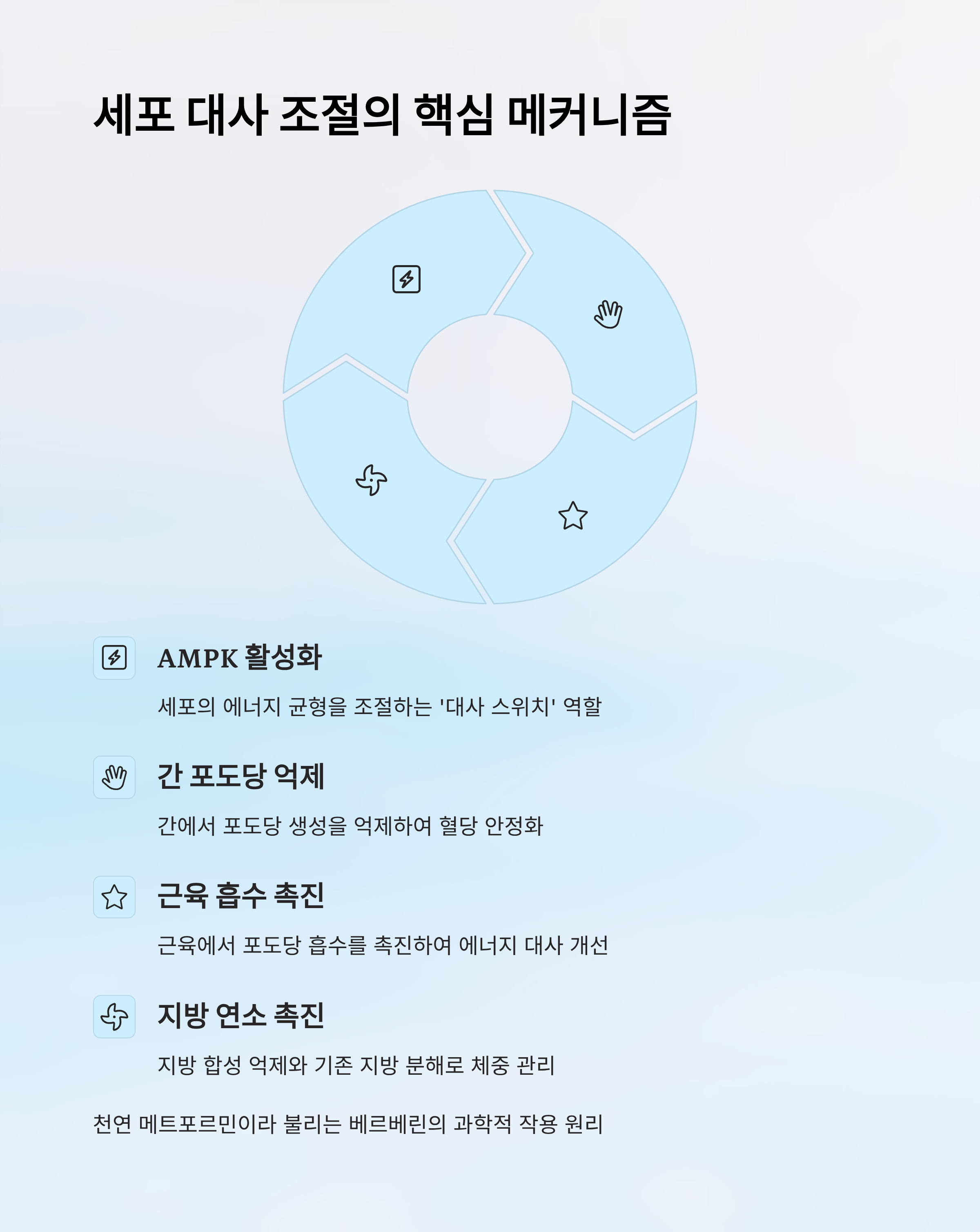 특히 AMP-활성화 단백질 키나아제(AMPK)를 활성화해 세포 대사 효율을 높이는 것이 핵심 작용인데요. 이로 인해 혈당이 조절되고 체지방 축적이 억제돼 당뇨병이나 대사증후군 관리에 긍정적인 영향을 줄 수 있어요. 하지만 잘못된 복용이나 과다 섭취는 위장 장애나 저혈당 같은 부작용을 일으킬 수 있답니다.