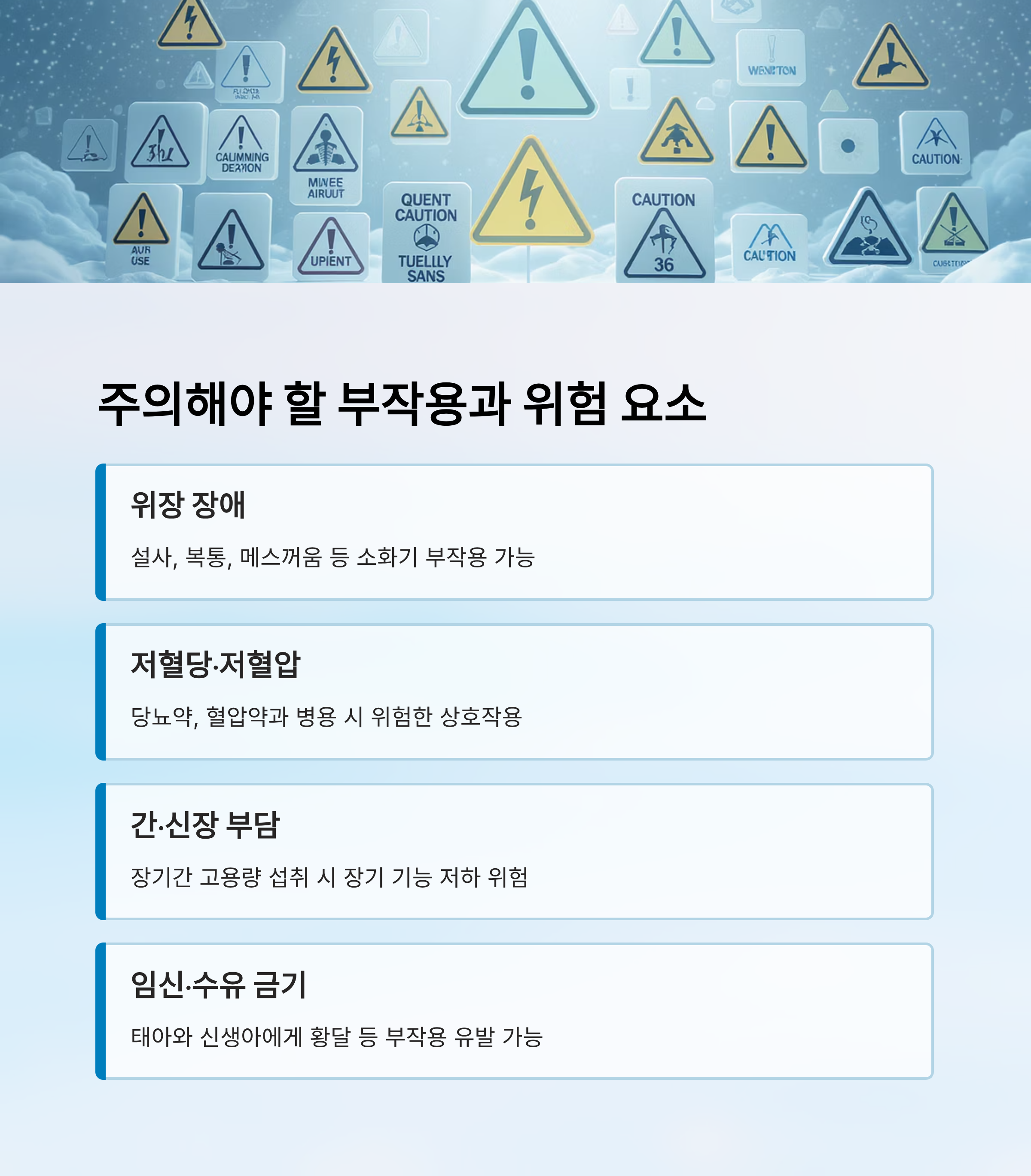 | 간/신장 부담 | 장기적 고용량 섭취 | 간·신장 질환자 |