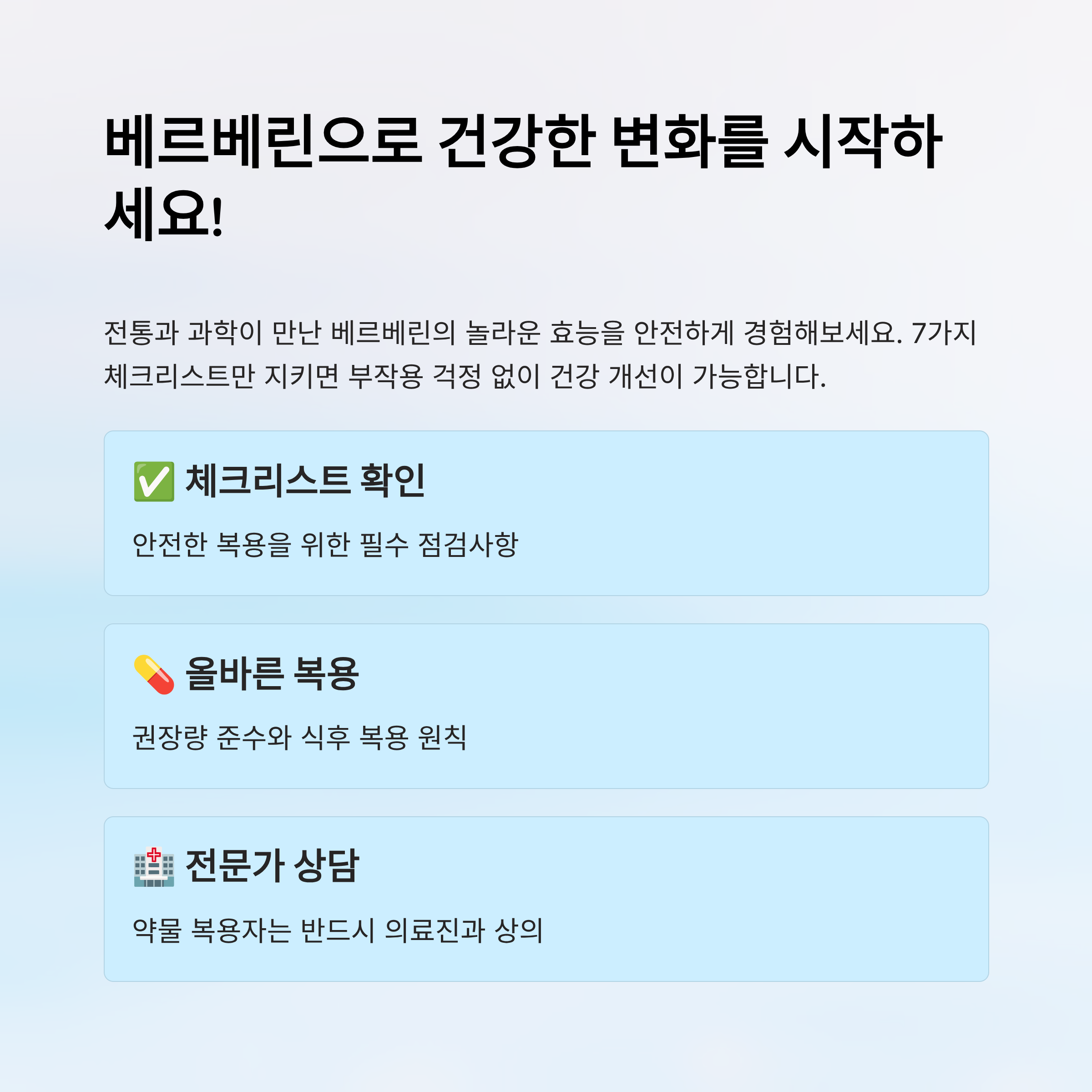 이 7가지 원칙을 지킨다면, 부작용 걱정 없이 베르베린의 효능을 안전하게 누릴 수 있어요. 🛡️