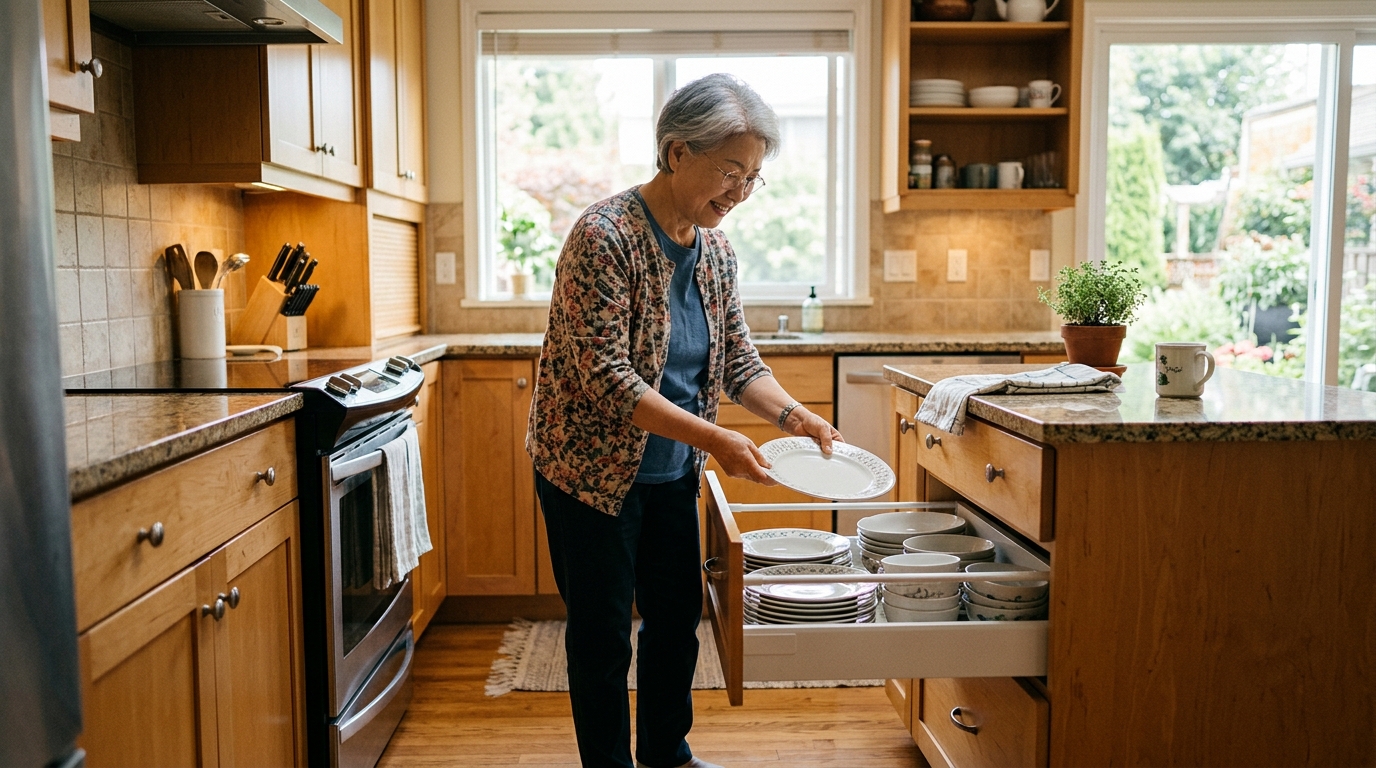 주방 사고는 주로 높은 곳에 있는 물건을 꺼내려다 발생합니다. 의자나 발판 위에 올라가는 행위는 시니어에게 매우 위험합니다. 자주 쓰는 그릇과 냄비는 허리 높이의 수납장으로 옮기고, 무거운 짐은 바닥 가까운 곳에 두어 무게 중심을 낮춰야 합니다.