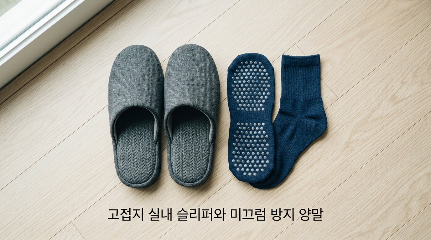 환경 못지않게 중요한 것이 복장입니다. 바지 기장이 너무 길어 발에 밟히지는 않는지 확인해 보세요. 또한, 집 안에서 신는 슬리퍼는 바닥 면이 매끄러우면 오히려 독이 됩니다. 발등을 감싸주고 바닥에 마찰력이 충분한 실내용 안전화를 신는 것이 좋습니다.