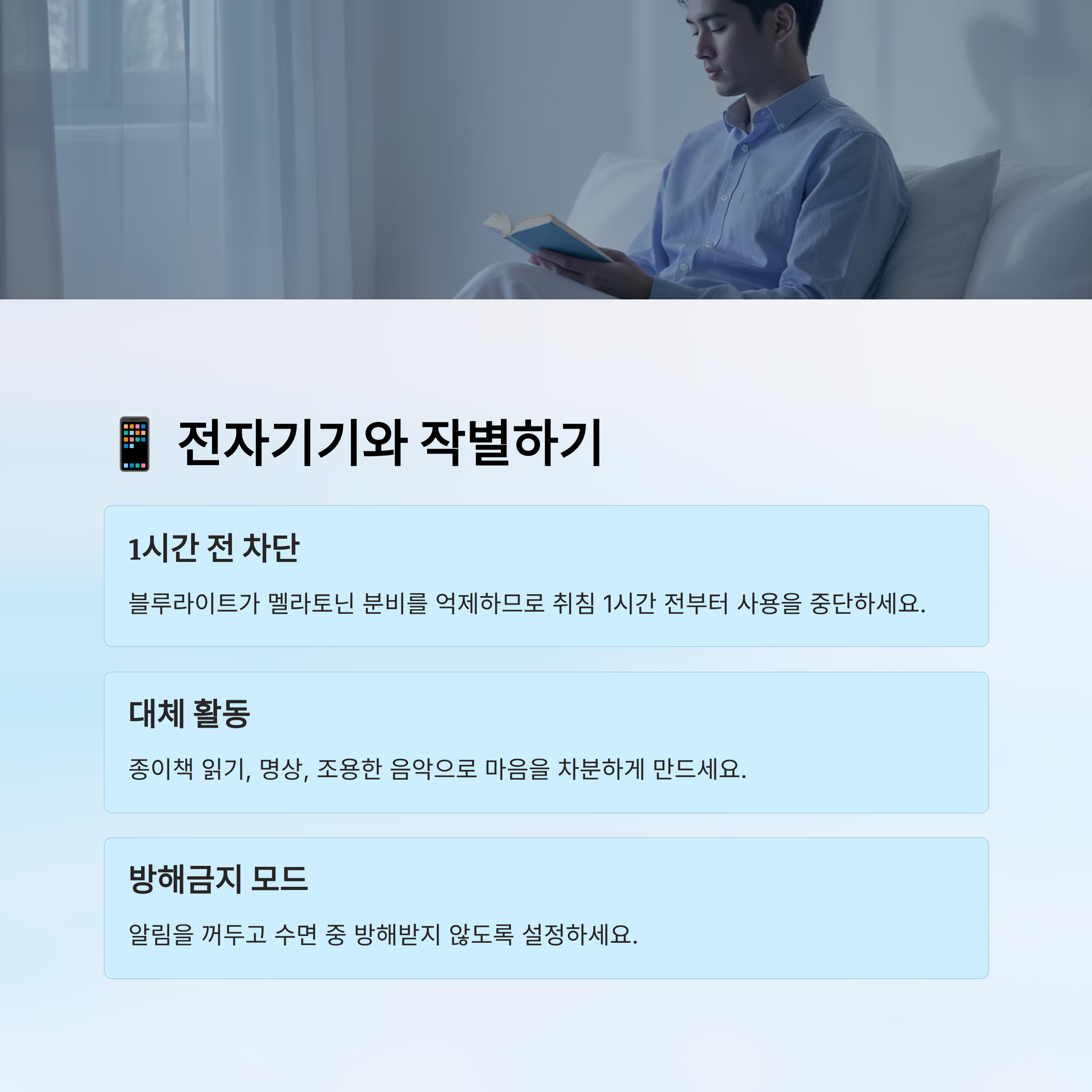 | 전자기기 금지 시간 | 잠들기 1시간 전부터 | 멜라토닌 분비 활성 |