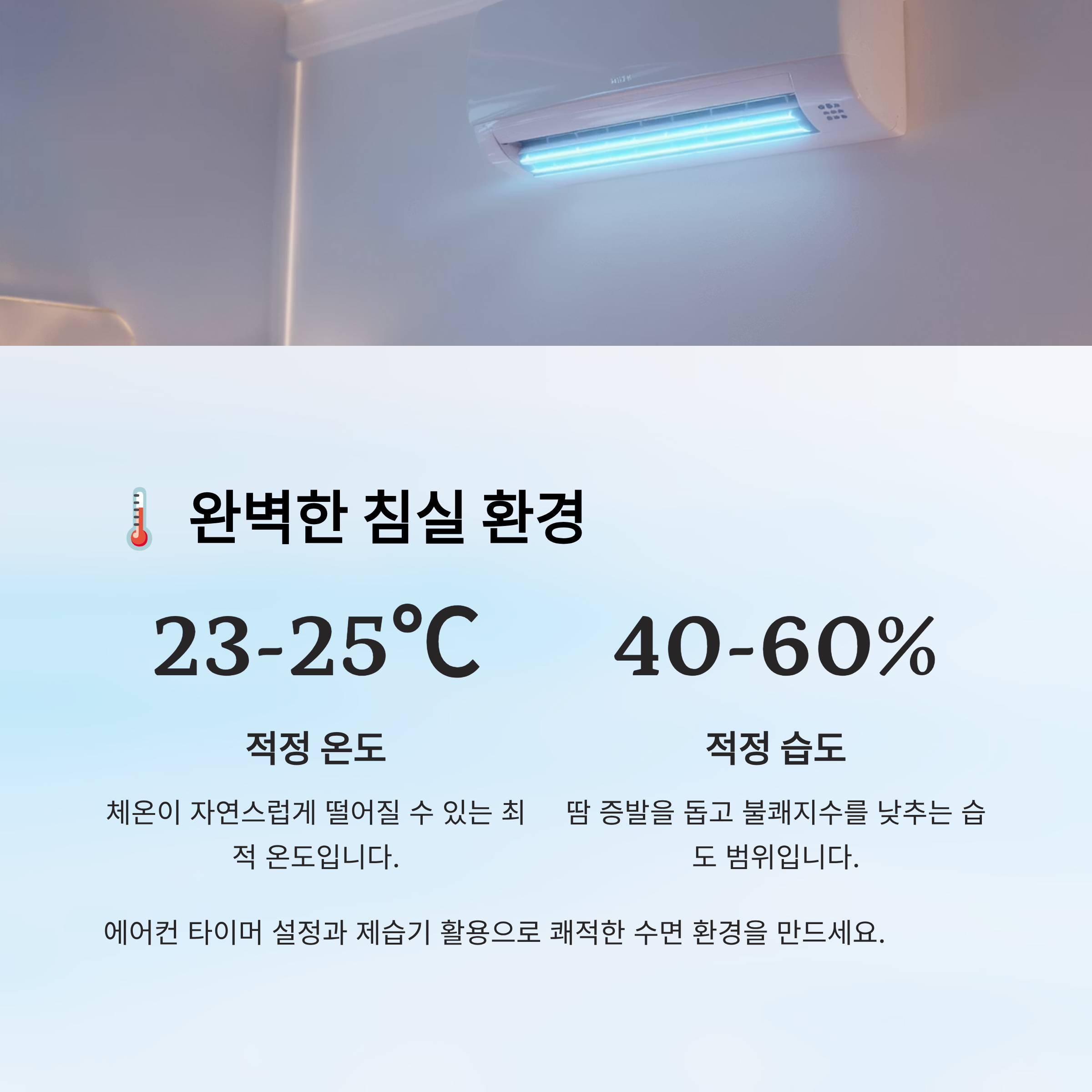 숙면을 위해선 침실이 ‘내 몸에 맞는 온도와 습도’로 맞춰져 있어야 해요. 무더위에 잠 못 드는 밤, 환경 조절 하나만으로도 상황이 확 바뀔 수 있답니다. 🌃