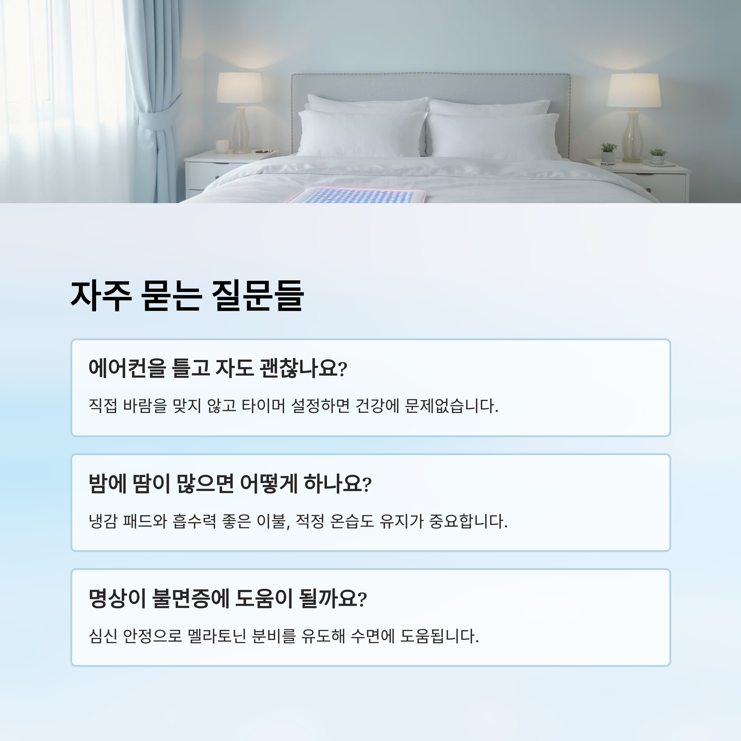 | 침구 | 통기성 좋은 면 소재 | 냉감 패드, 얇은 이불 |