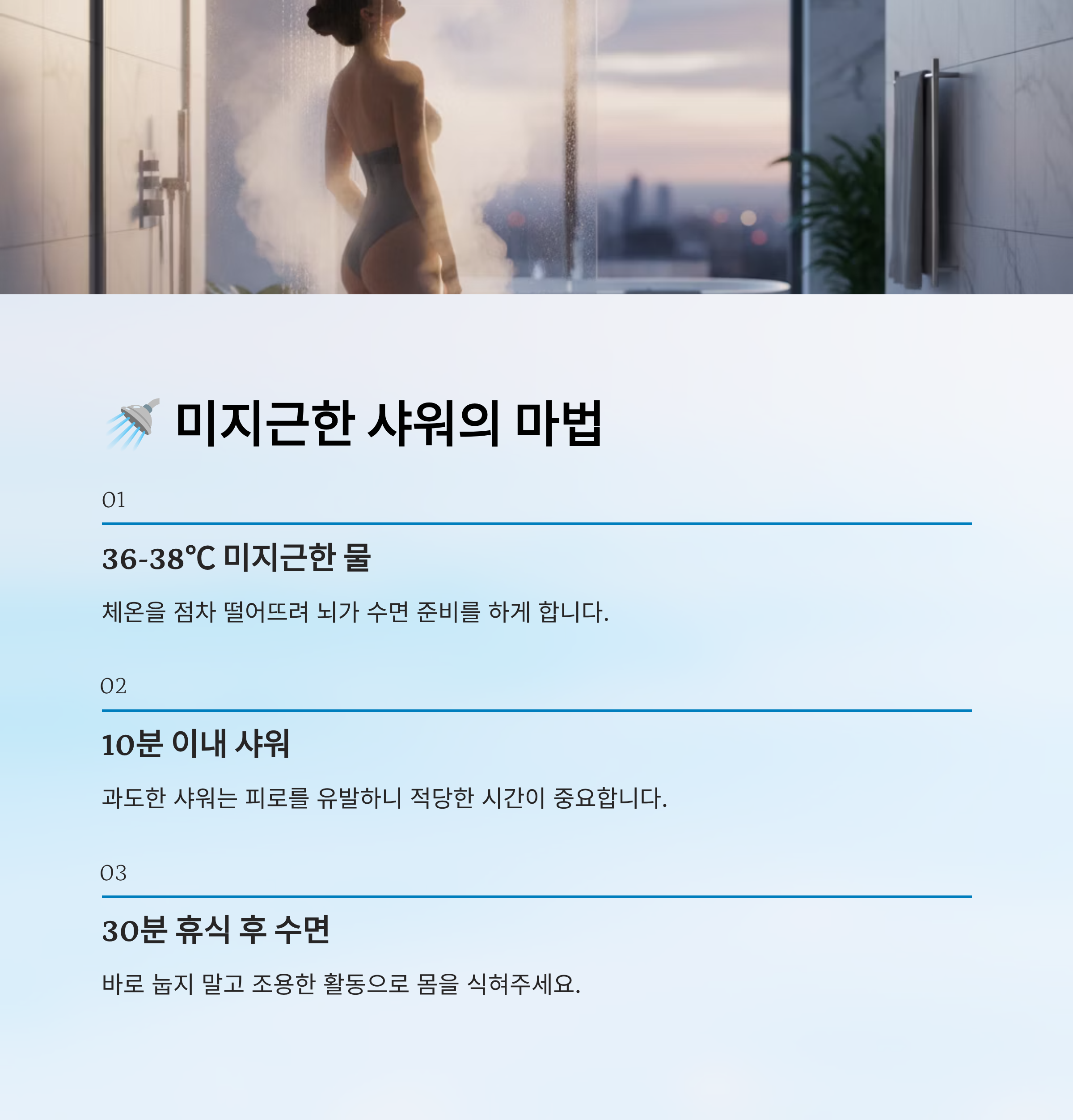 너무 뜨거운 물로 샤워하면 오히려 체온이 올라가고, 몸이 각성 상태가 되어버릴 수 있어요. 반대로 찬물 샤워는 일시적으로 시원할 수 있지만, 자율신경계를 자극해서 수면을 방해할 수도 있어요. 미지근한 물이 가장 좋아요.