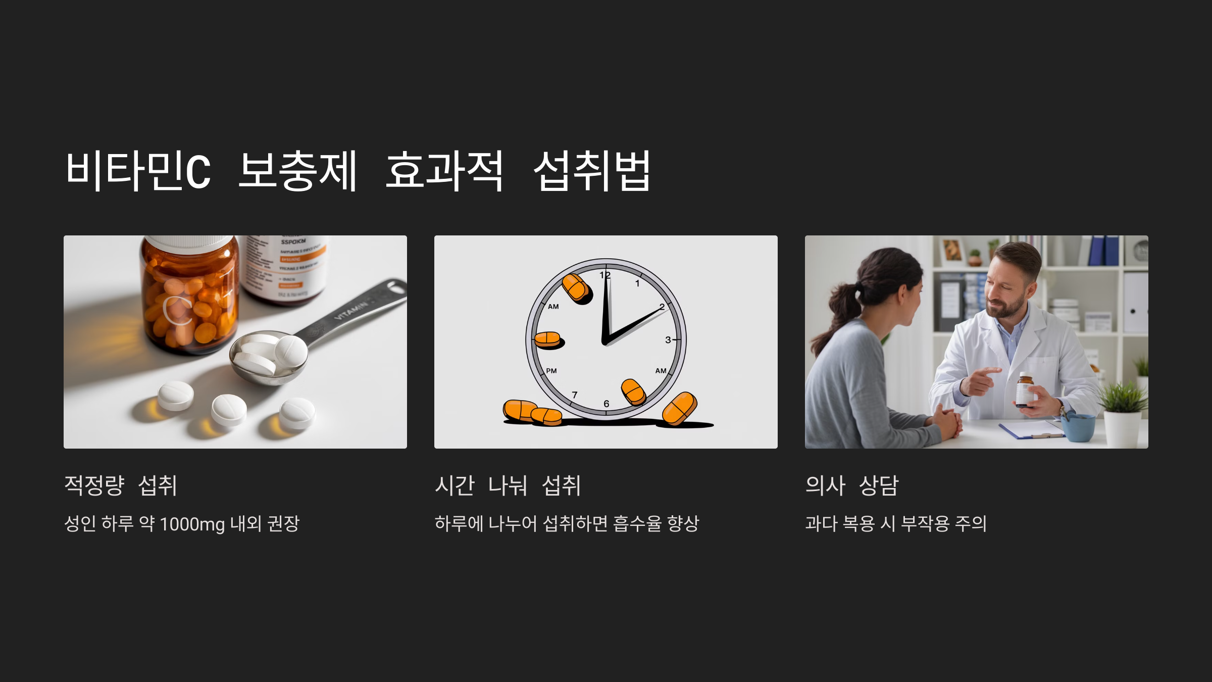 음식만으로 충분히 섭취하지 못할 경우, 비타민C 보충제를 활용할 수 있어요. 하지만 효과를 극대화하려면 몇 가지 주의점이 필요합니다.