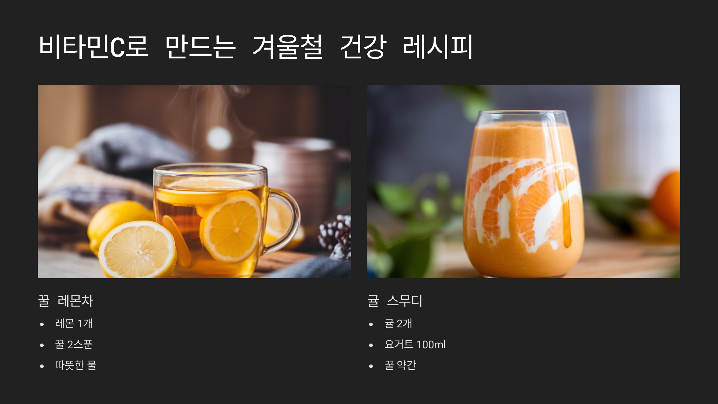 이 두 가지 레시피는 비타민C 섭취와 함께 몸을 따뜻하게 유지할 수 있어요. 😊