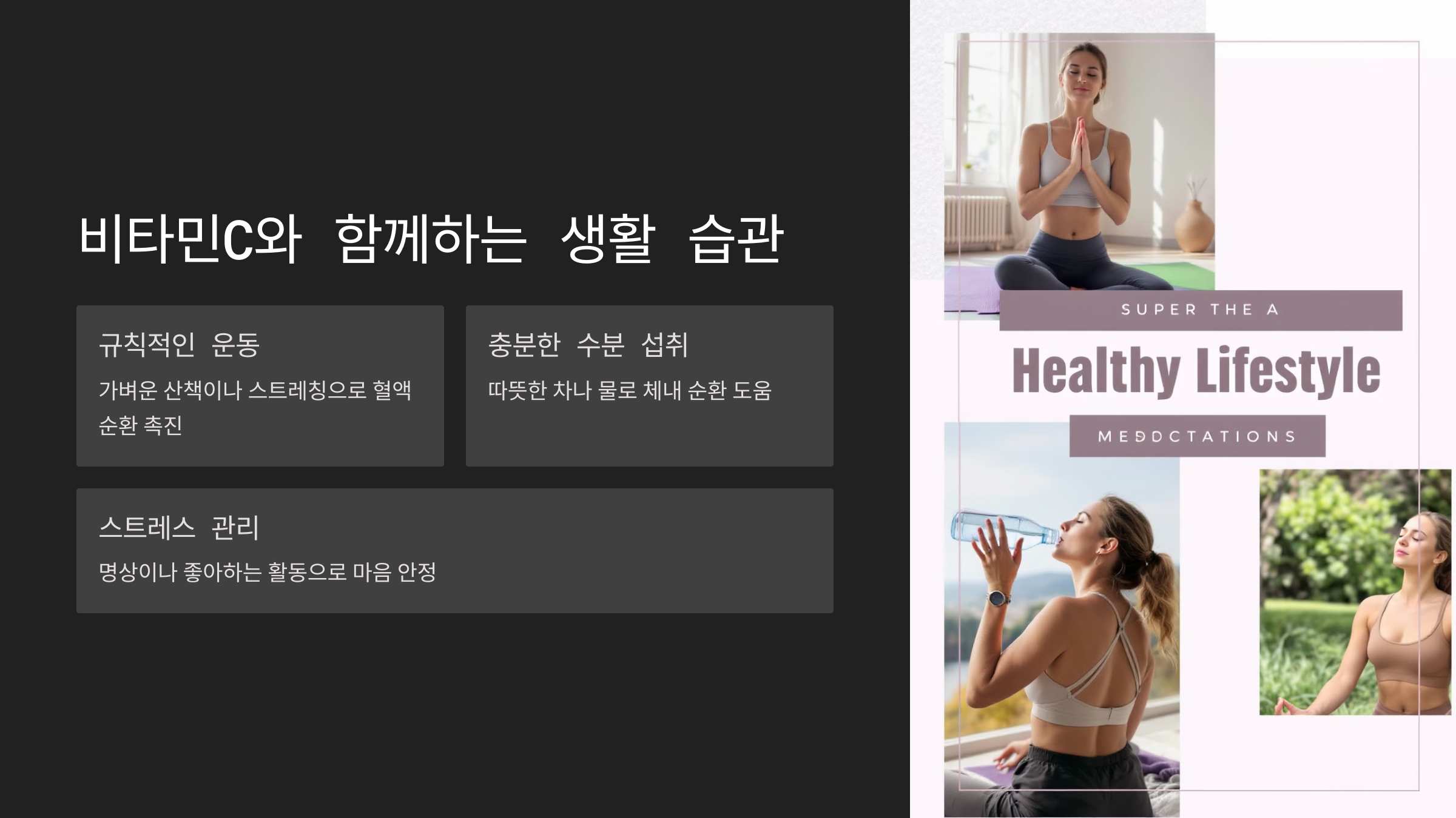 이렇게 균형 잡힌 생활을 실천하며 비타민C 섭취를 병행하면 효과가 배가 됩니다.