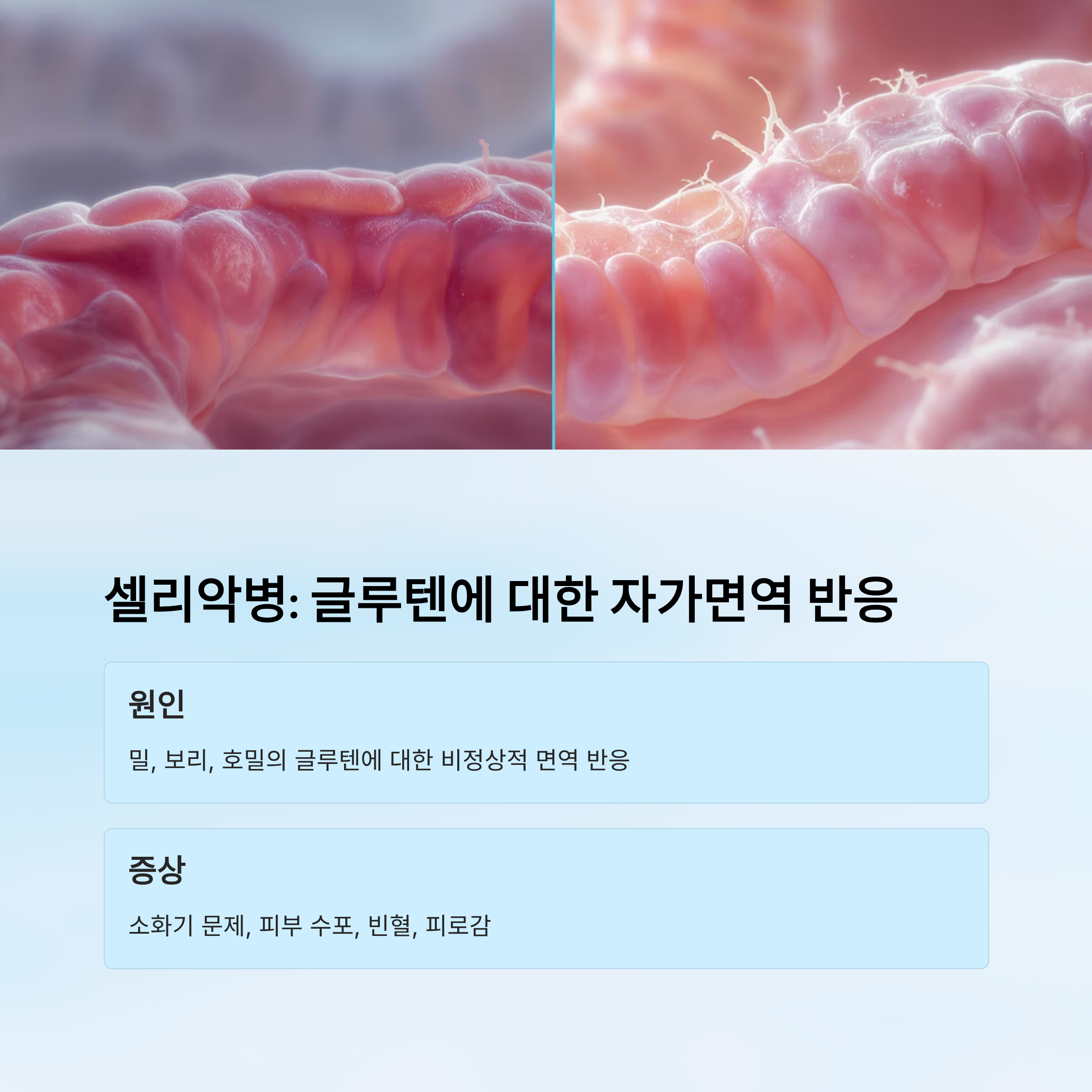 셀리악병은 인체가 밀, 보리, 호밀 등에 들어 있는 단백질인 글루텐에 비정상적으로 반응하면서 발생하는 자가면역질환이에요. 글루텐이 소장에서 분해되지 않고 면역 반응을 유발하면 장 점막이 손상돼 영양소 흡수가 방해받게 되죠. 이 때문에 환자들은 설사, 체중 감소, 영양 결핍 같은 소화기 증상을 자주 경험하게 돼요.