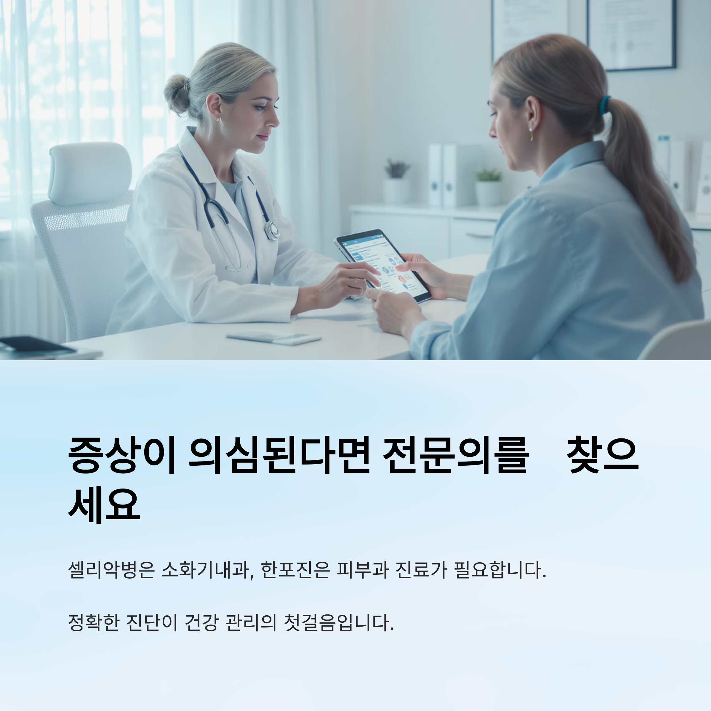 두 질환을 진단할 때 중요한 포인트는 ‘전신 증상 동반 여부’예요. 단순히 피부에만 국한된 증상이라면 한포진일 가능성이 크지만, 빈혈·체중 감소·소화기 불편감이 동반된다면 셀리악병을 반드시 고려해야 해요.