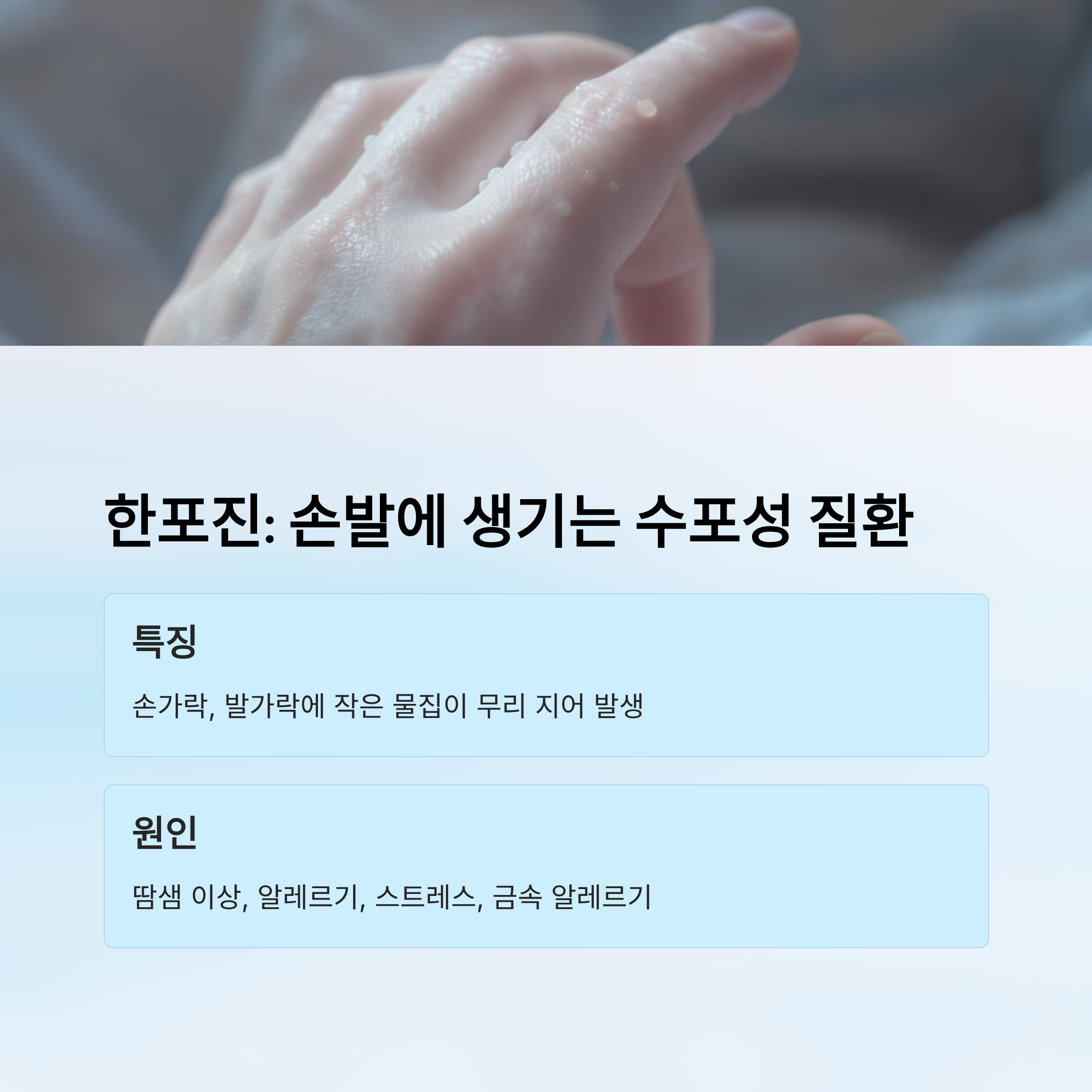 한포진은 손가락이나 손바닥, 발가락이나 발바닥에 작은 물집이 반복적으로 생기는 만성 피부질환이에요. 이 물집은 보통 맑은 액체로 차 있으며, 크기가 쌀알 정도로 작지만 여러 개가 무리지어 발생하기 때문에 불편함이 크답니다. 특히 손을 자주 쓰는 사람들에게는 생활에 직접적인 영향을 줄 수 있어요.