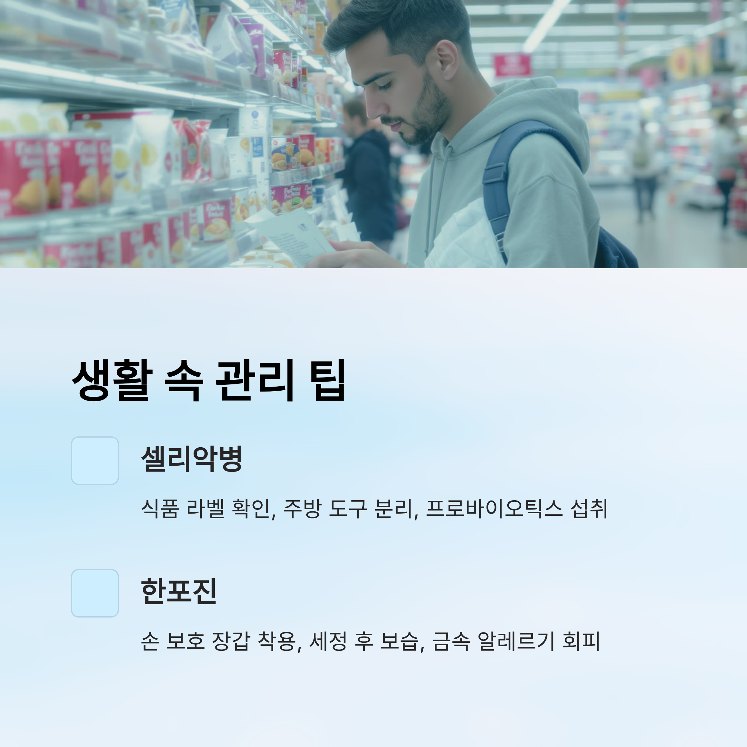 | 예방 관리 | 식품 라벨 꼼꼼히 확인 | 손 보호, 자극 회피 |