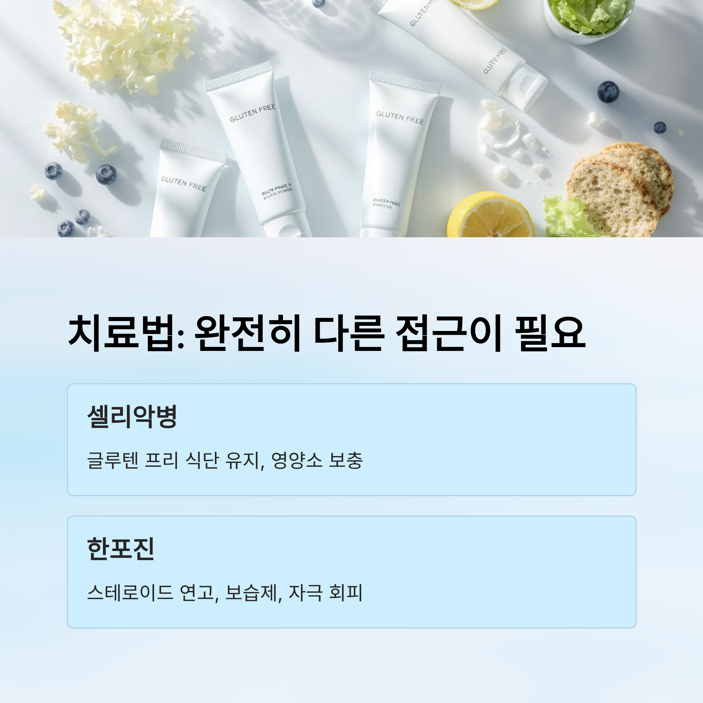 셀리악병과 한포진은 치료 접근법이 완전히 달라요. 셀리악병은 자가면역 반응으로 인해 발생하는 질환이기 때문에 약물로 증상을 억제하는 것보다, 원인인 글루텐을 피하는 것이 핵심 치료예요. 반대로 한포진은 피부 염증 질환이므로 국소 치료와 생활습관 관리가 중심이 돼요.
