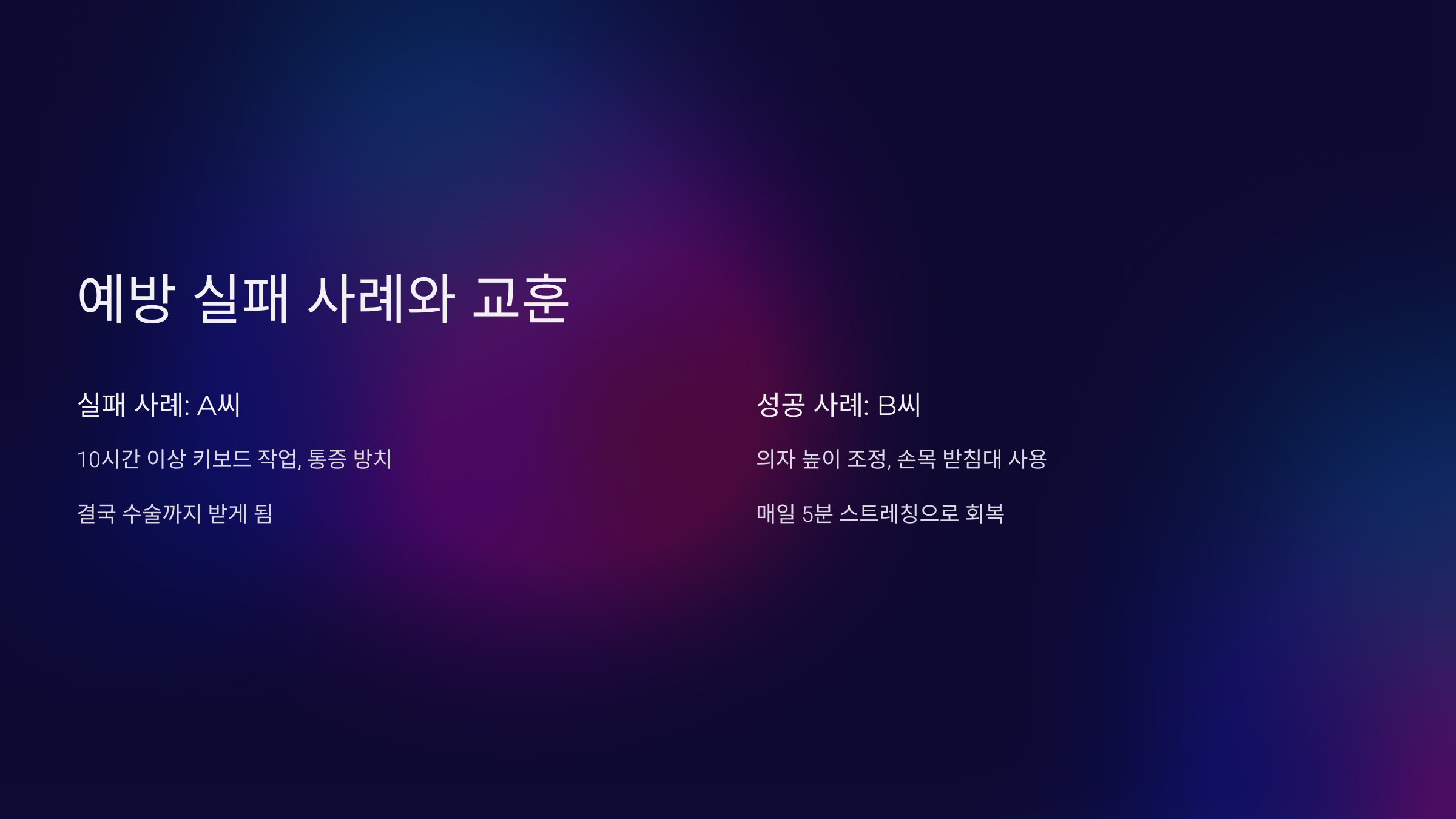 한 IT 회사에 근무하던 A씨는 하루 10시간 이상 키보드 작업을 했어요. 손목 통증을 느꼈지만 가볍게 여기고 방치했죠. 결국 손목 터널 증후군이 심각해져 수술까지 받게 되었답니다. 이 사례는 초기에 예방하고 대처하지 않으면 질환이 악화될 수 있음을 보여줘요.