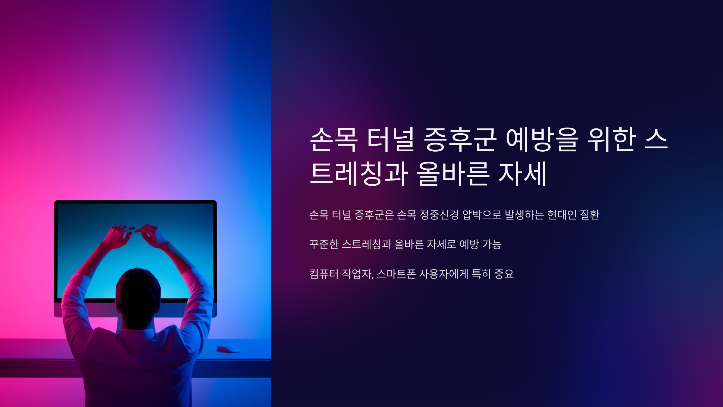 특히, 컴퓨터 작업이 많거나 스마트폰 사용 시간이 긴 사람들에게는 예방이 더욱 중요해요. 이제 손목 터널 증후군 예방을 위해 실천할 수 있는 스트레칭 동작과 자세에 대해 알아보려고 해요.