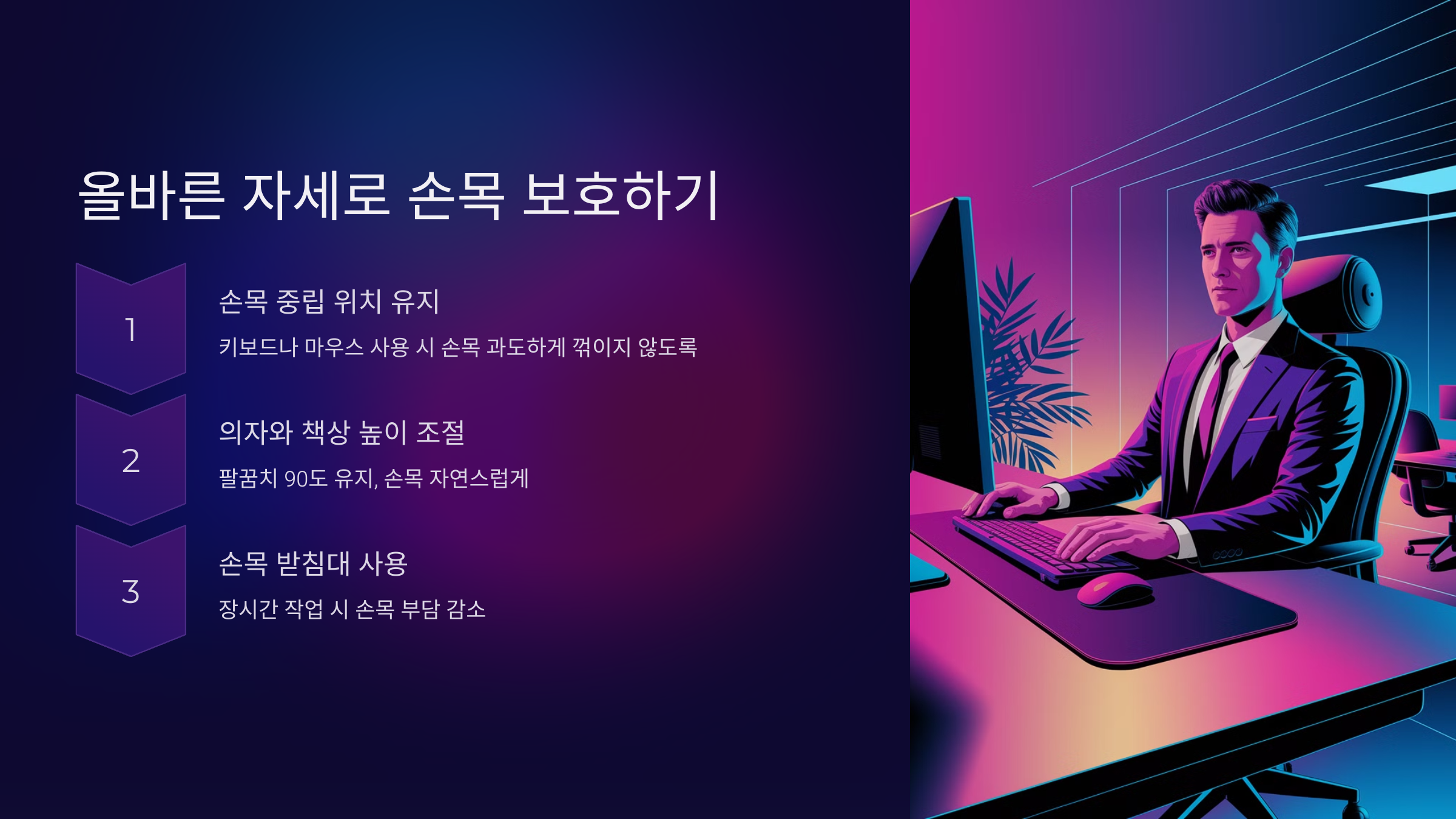 1. 손목의 중립 위치 유지: 키보드나 마우스를 사용할 때 손목이 과도하게 꺾이지 않도록 중립 위치를 유지하세요. 손목이 자연스럽게 곧게 펴져 있는 상태가 좋아요.
