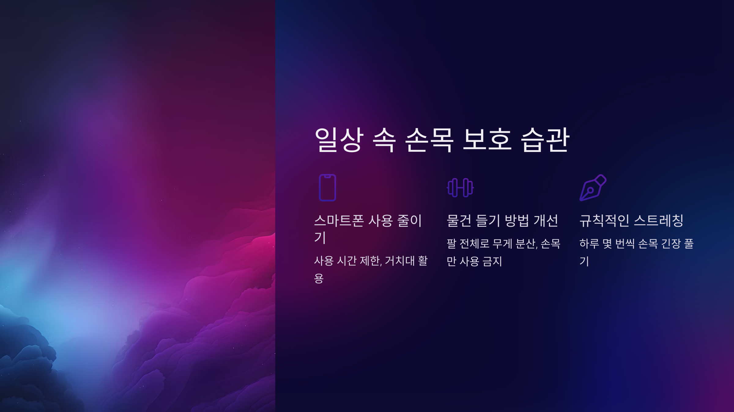 1. 스마트폰 사용 줄이기: 스마트폰을 장시간 사용하면 손목에 부담을 줄 수 있어요. 사용 시간을 제한하고, 스마트폰 거치대를 활용해 손목의 부담을 줄여보세요.