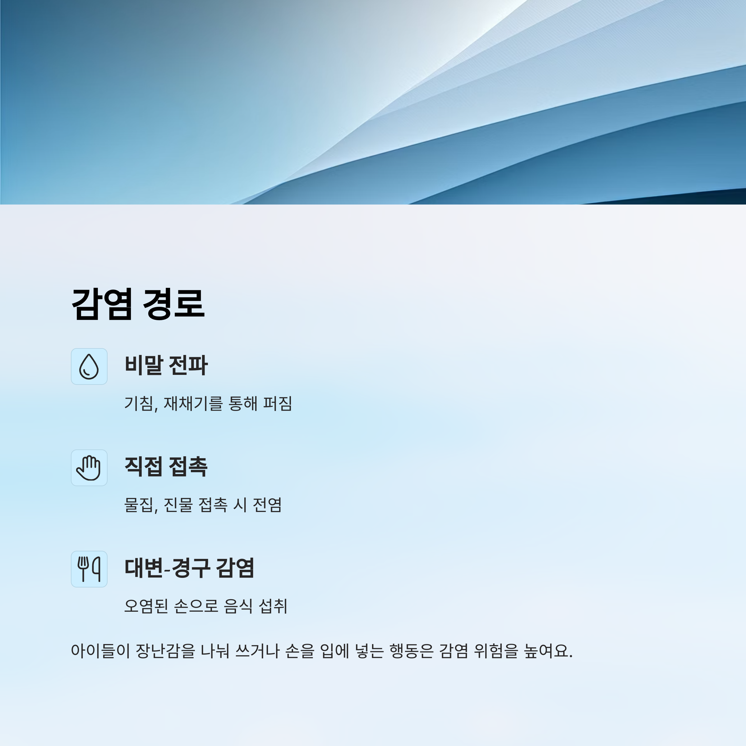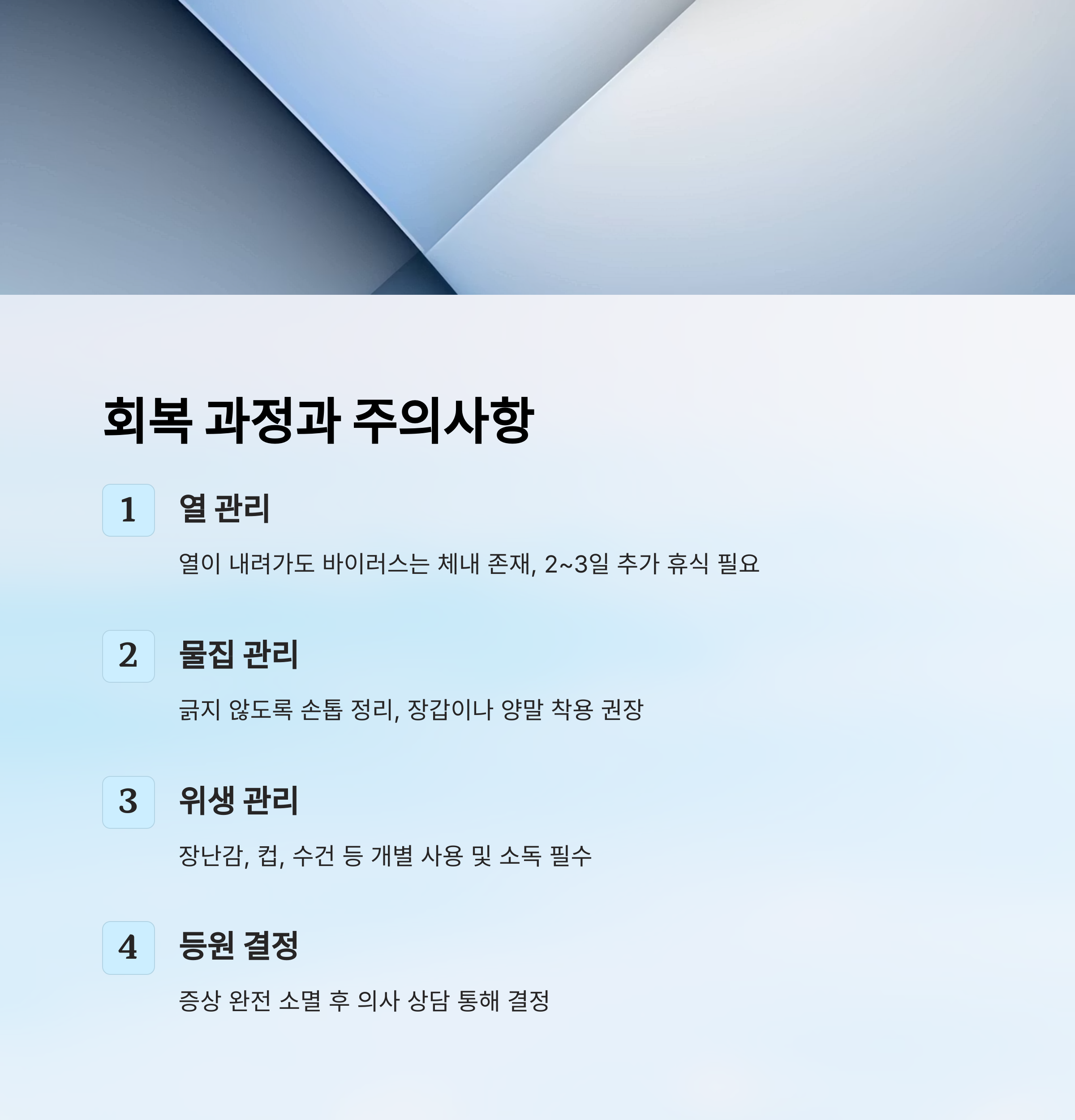 아이들이 좋아졌다고 뛰어놀고 싶어할 수 있지만, 2~3일 정도 더 쉬게 하는 게 좋아요. 무리한 활동은 면역력 저하로 이어질 수 있고, 다른 아이에게 전파할 수도 있으니까요. 부모님도 회복기 위생에 함께 신경 써야 해요! 🧽
