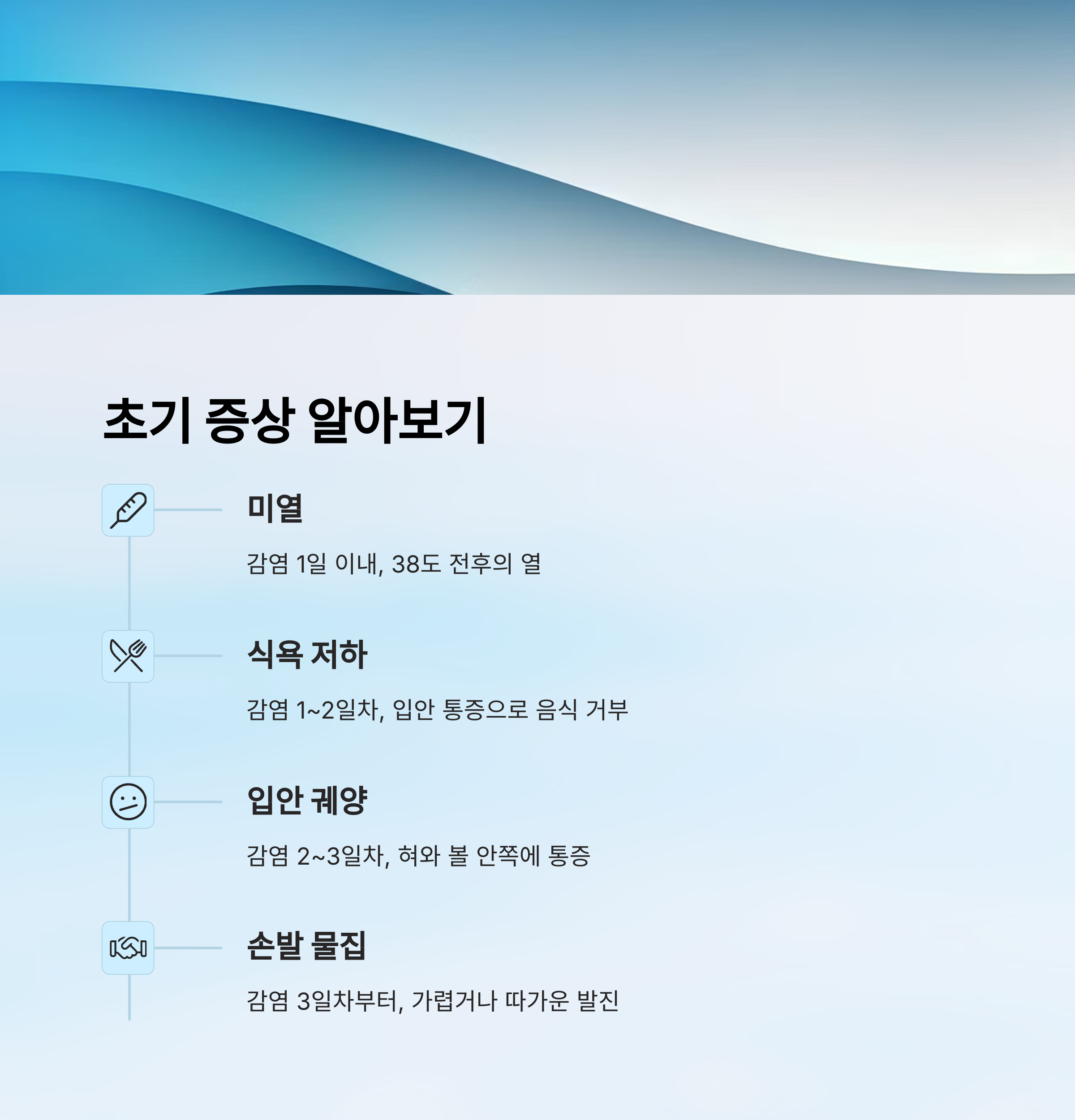 가장 먼저 나타나는 전조 증상은 미열(38도 이하), 피로감, 입안 통증 등이에요. 아이가 밥을 잘 먹지 않고 침을 많이 흘리거나 입안이 아프다고 하면 의심해볼 수 있어요. 특히 침을 자꾸 뱉거나 젖병을 거부한다면 주의가 필요하죠.